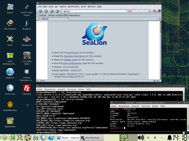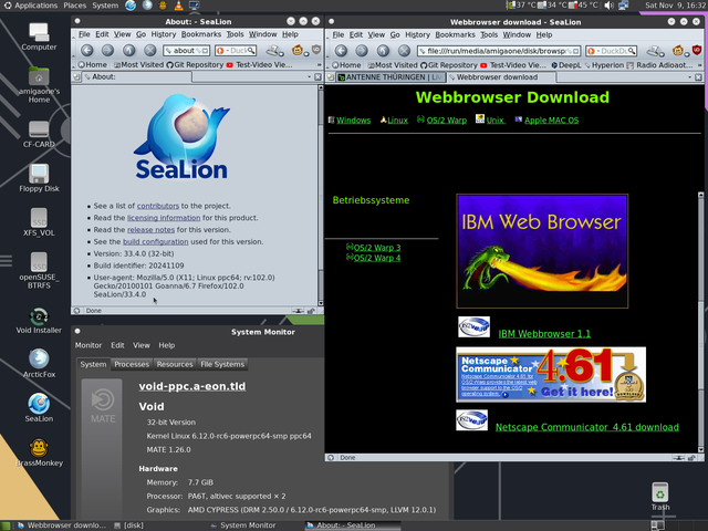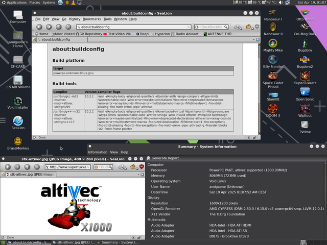 I compiled SeaLion 33.4.0 with the new Goanna layout and rendering engine 6.7 for older Linux PPC distributions for example Void PPC without AltiVec support today.