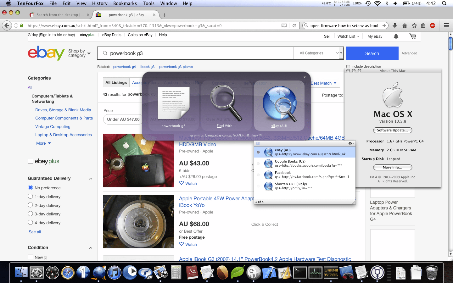 The only quirk was I had to manually install the search engine catalog into `~/Library/Caches/Quicksilver/Indexes/` as the API lookup required HTTPS and Leopard has out of date TLS/SSL system certs which are not compatible. So I pulled the catalog using the same build running on 10.6 under Rosetta.
