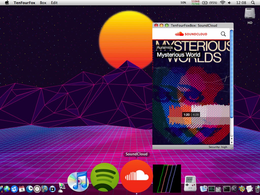Relinking the Fluid app you create against Leopard Webkit can make a serious difference.You can use Fluid (Leopard only) or TenFourFoxBox to make a webapp of it, however, SoundCloud is CPU intensive - on my 1.5GHz 12" Powerbook, a FoxBox of the site runs between 85-90 % CPU. The way round this is to go to the mobile version but the site is quite picky about user agents, so I've attached one that works.