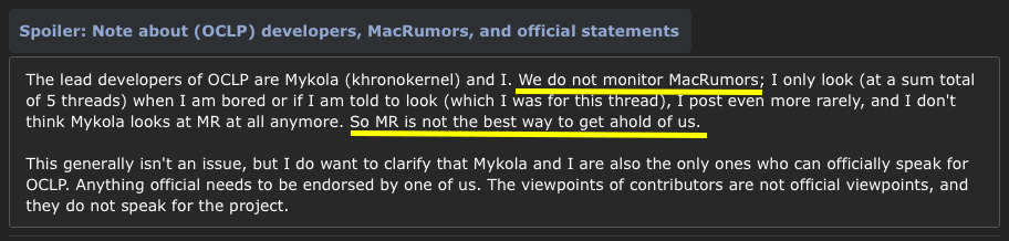At significant risk to relationships with Devs and MacRumors peers, I decided to voice my concerns. I appreciate the professional and courteous responses from Ball of Neon (an OCLP Dev)