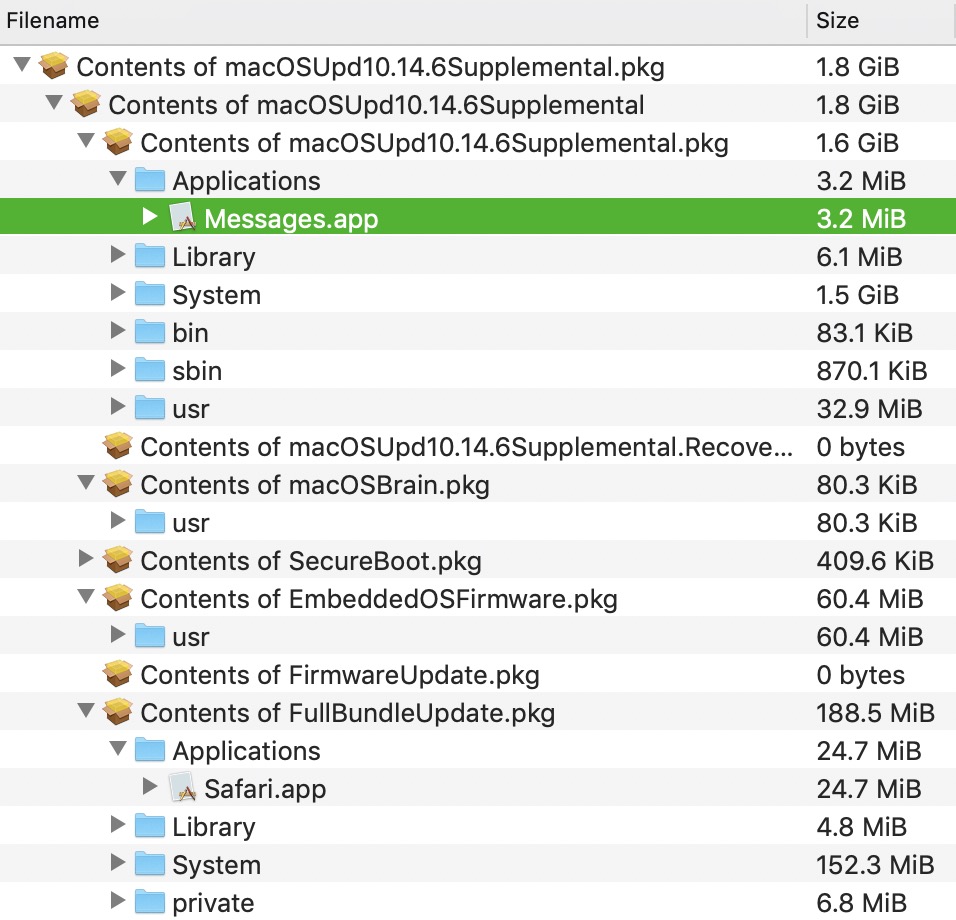 Then I went for the smaller one and it installed well. I wonder if the bigger one didn't work because I already had safari 14? Opening the package with Pacifist I found so more stuff, like Messages and a lot more as you can see.