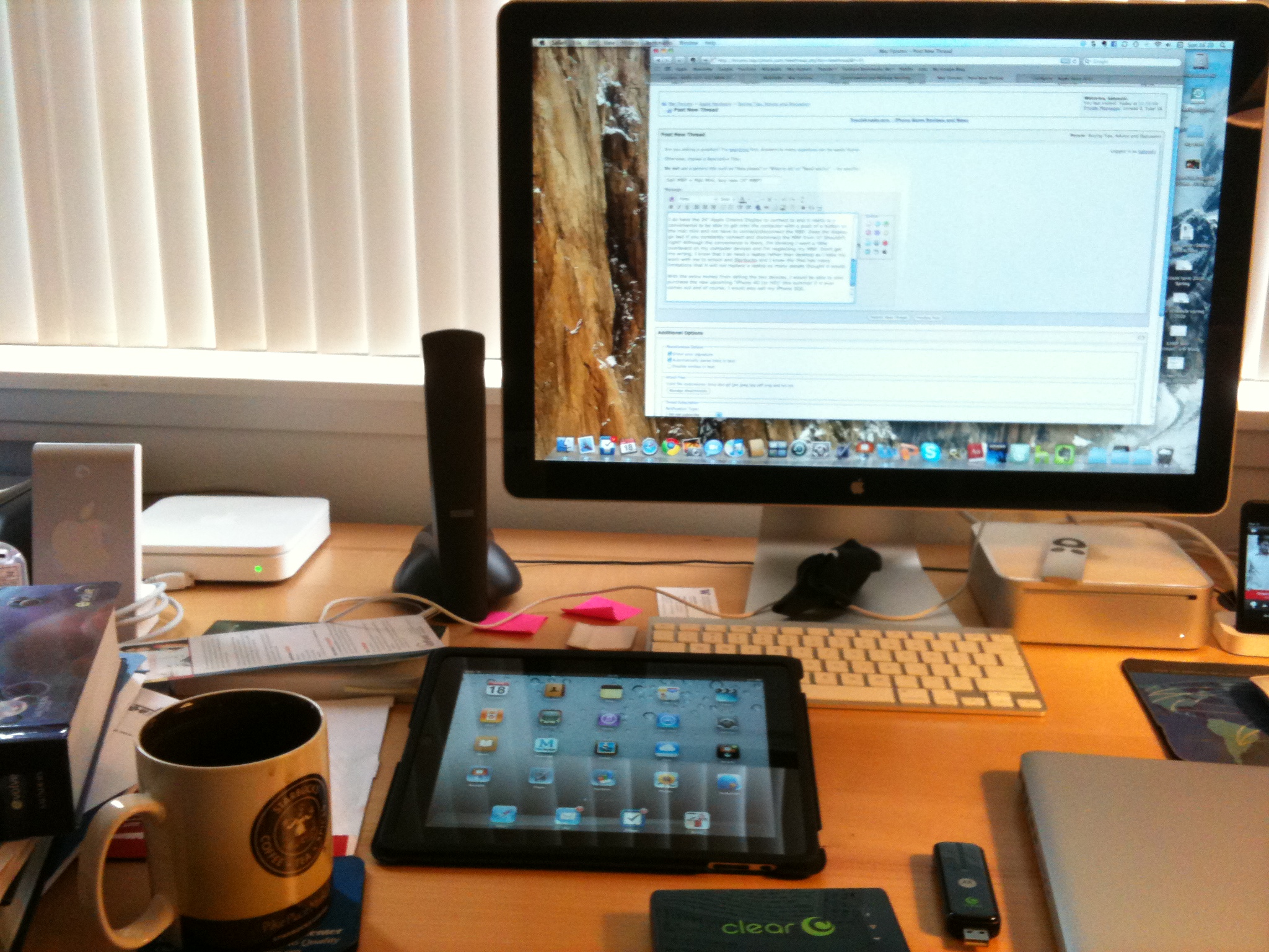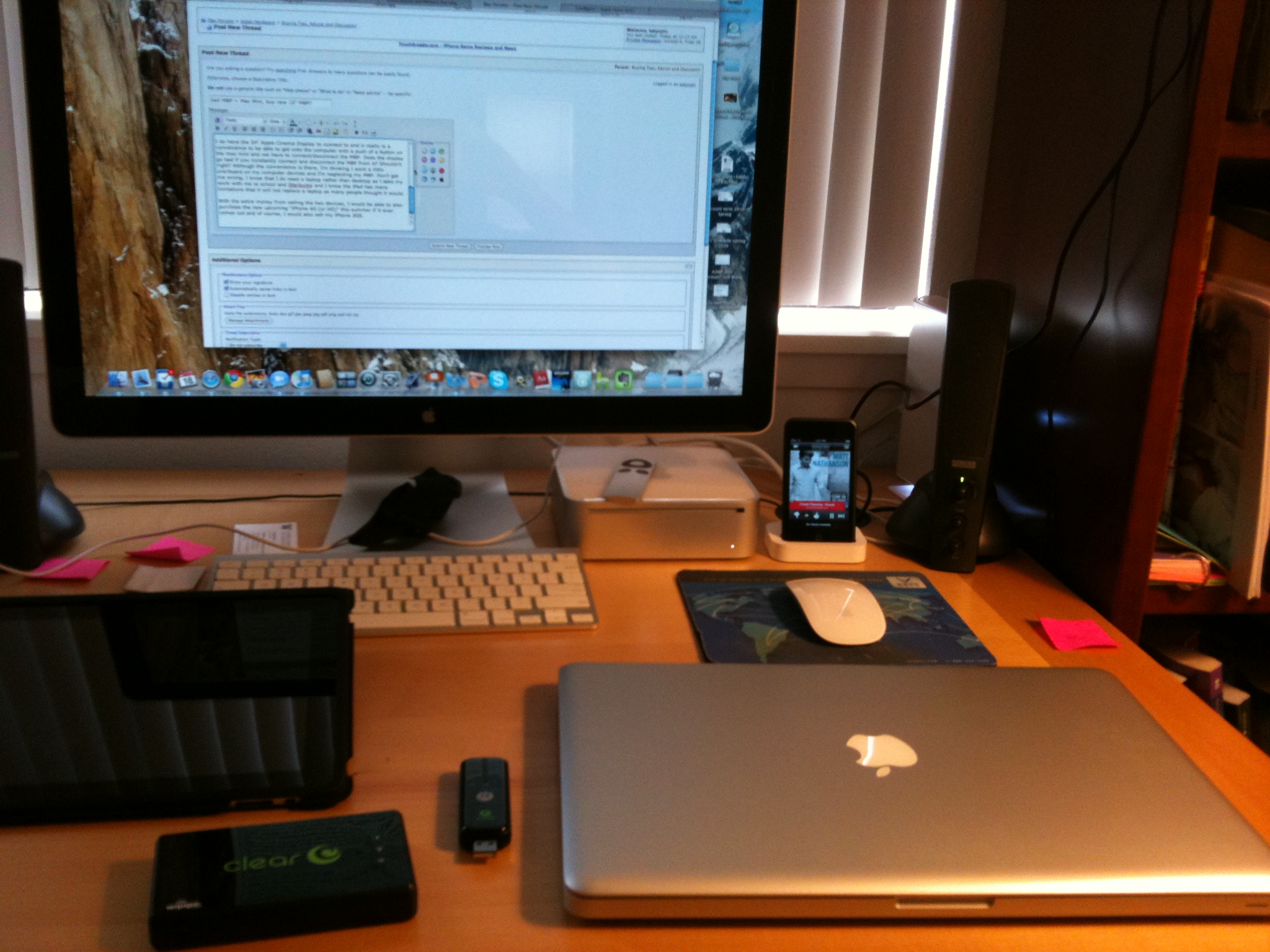 I do have the 24" Apple Cinema Display to connect to and it really is a convenience to be able to get onto the computer with a push of a button on the mac mini and not have to connect/disconnect the MBP. Does the display go bad if you constantly connect and disconnect the MBP from it? Shouldn't right? Although the convenience is there, I'm thinking I went a little overboard on my computer devices and I'm neglecting my MBP. Don't get me wrong, I know that I do need a laptop rather than desktop as I take my work with me to school and Starbucks and I know the iPad has many limitations that it will not replace a laptop as many people thought it would.