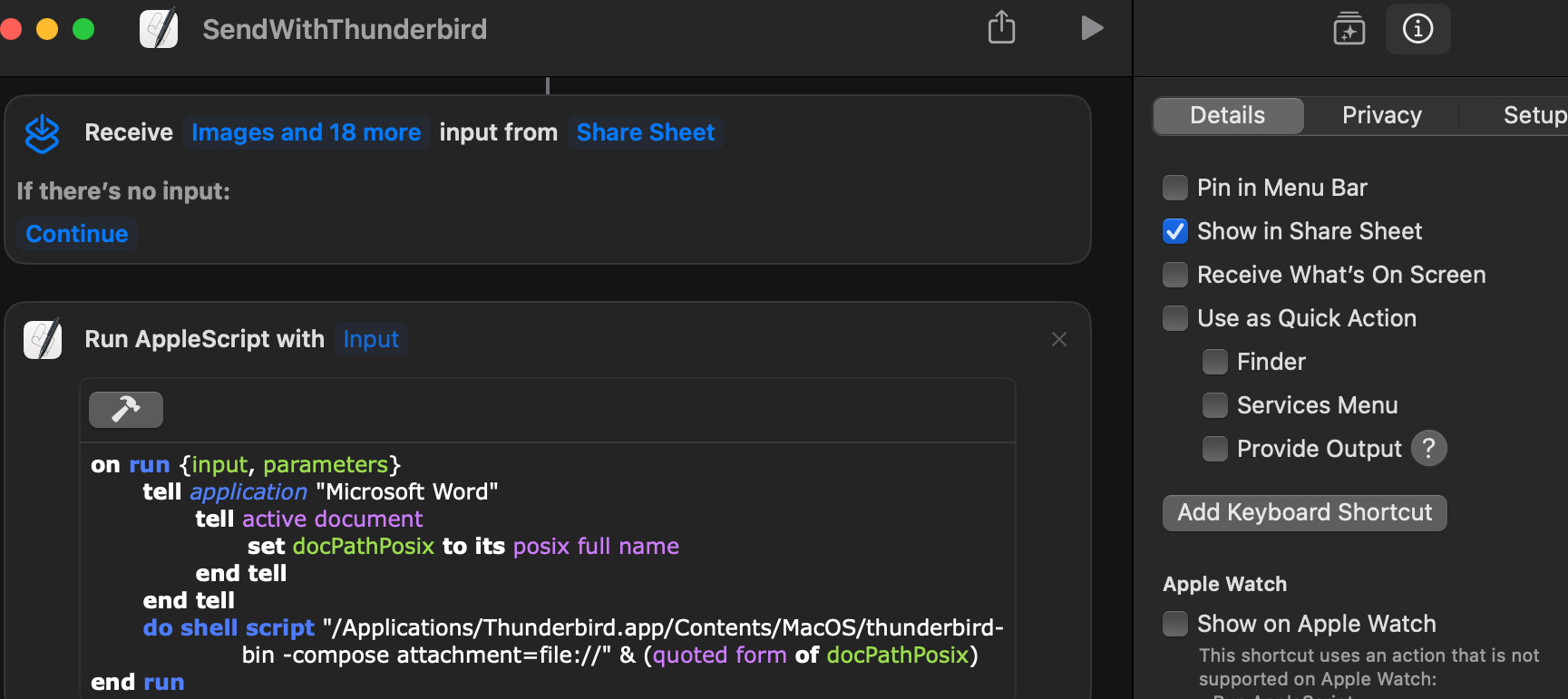2. Also, when attempting to share a file from the Finder, Thunderbird is not an available option. When I select "Edit Extensions", the Thunderbird icon shows in the list but there is no check box next to it so I can not select it as a sharing option. Is there a way I can make Thunderbird a usable option for sharing?