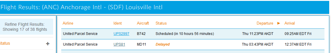 Nothing showed up on flightaware for UPS from ZhengZhou. Maybe they're trucking this batch to a different airport?Has anyone been able to find the flight number for this flight?