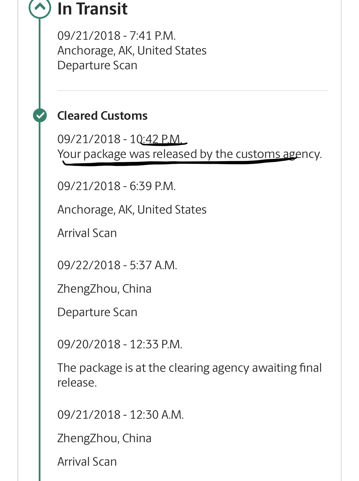 It’s showing now. Customs cleared time seem to be in EDT. I wonder where it happened though. Times are all screwed up.