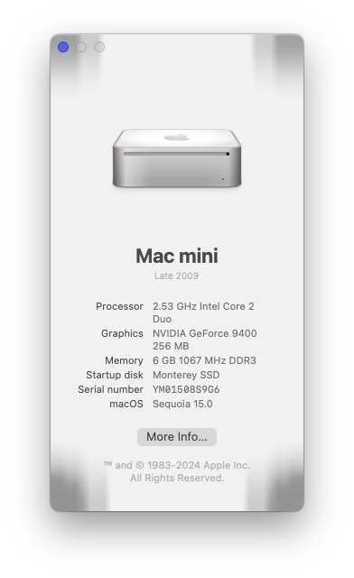 mikezang macrumors 6502a Original poster May 22, 2010 946 45 Tokyo, Japan Sep 20, 2024 #1 I installed Sequoia 15.0 to my external SSD on Mac mini Late 2009 with OCLP 2.0.1. Attachments Screenshot 2024-09-20 at 16.25.35.png 50 KB · Views: 171 Reactions: Funny Apple Man