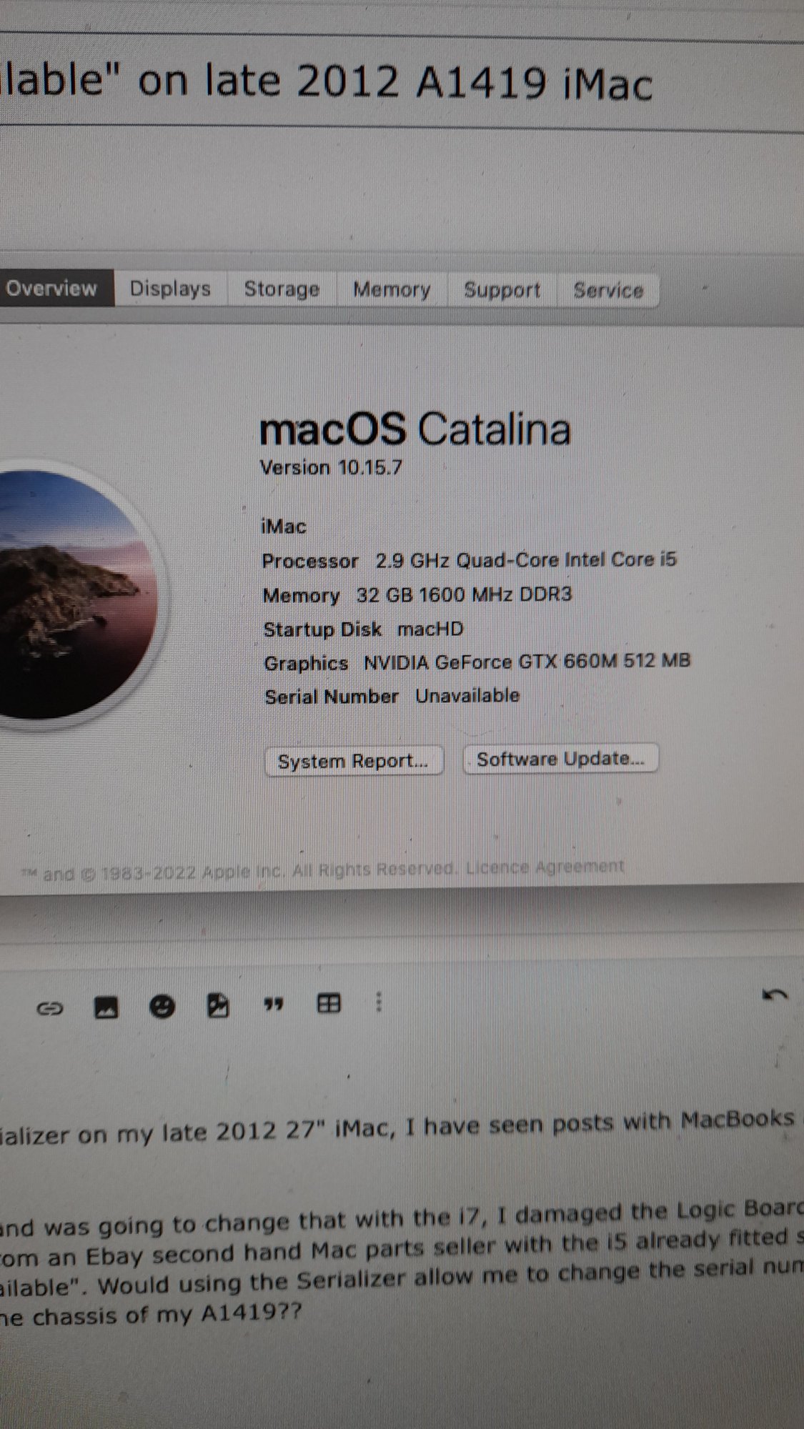 long story short, I have the i5 2.9 Ghz Quad and was going to change that with the i7, I damaged the Logic Boards pins when fitting the processor, I bought a 2nd hand Logic Board from an Ebay second hand Mac parts seller with the i5 already fitted so put everything back in my iMac, BUT, the serial number shows as "unavailable". Would using the Serializer allow me to change the serial number on the Logic Board so I have the same serial number as the one on the chassis of my A1419??