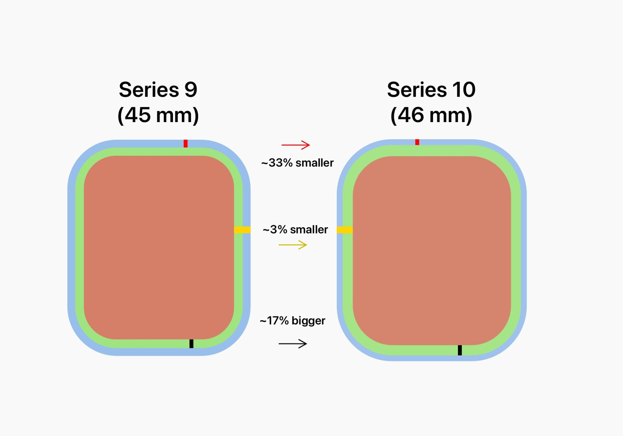 1 mm bigger, a more square-rounded shape, screen about 2 mm wider and overall 7% bigger (9,5% bigger 41mmVs42mm), 1 mm or 10% thinner, 10% lighter (40 gr my Series 7 GPS and 36 gr my Series 10 GPS+Cellular), new digital crown, longer side button, new speaker, the back side is now all one piece and it is made of metal and not sapphire. I would say that I liked the latter more before on an aesthetic level, although I like it to be all one piece.