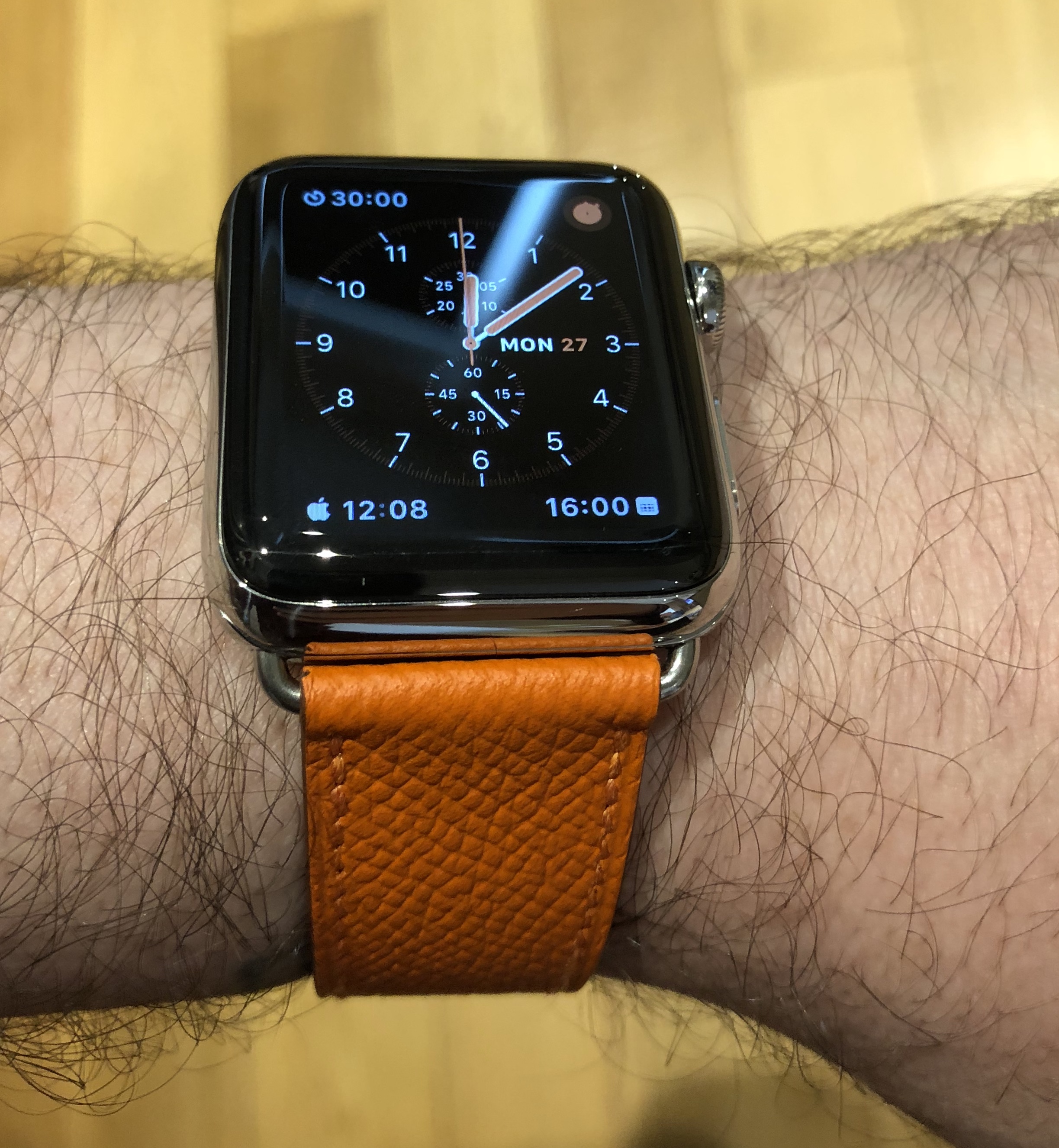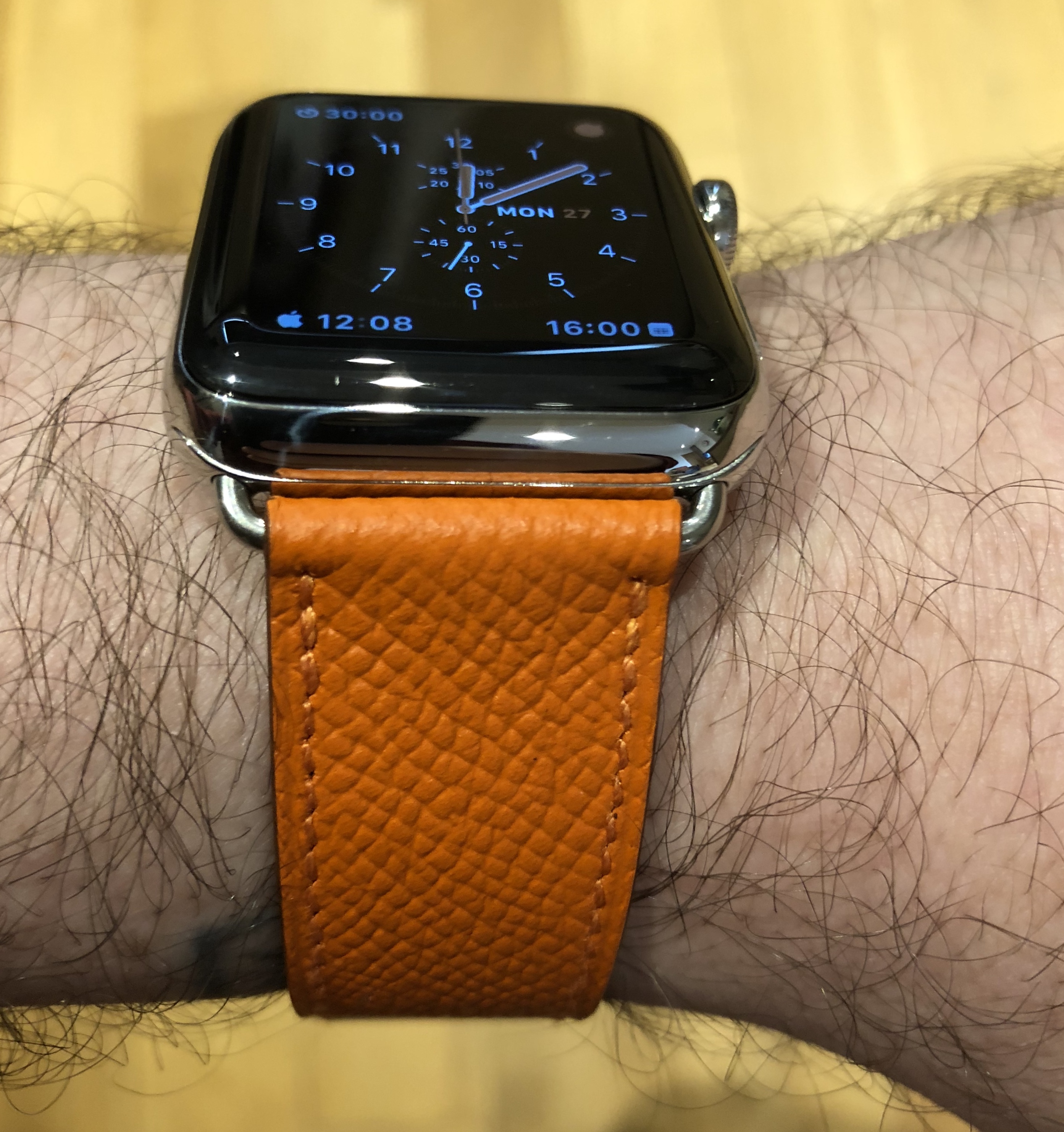 So the net cost of a stainless steel Apple Watch (with Hermès faces built in), a leather Hermès strap that I liked, plus the Hermès sports strap, the white plastic Hermès Apple Watch box and the orange cardboard Hermès Apple Watch box (both of which are very nice things to look at) would be about £1,350.