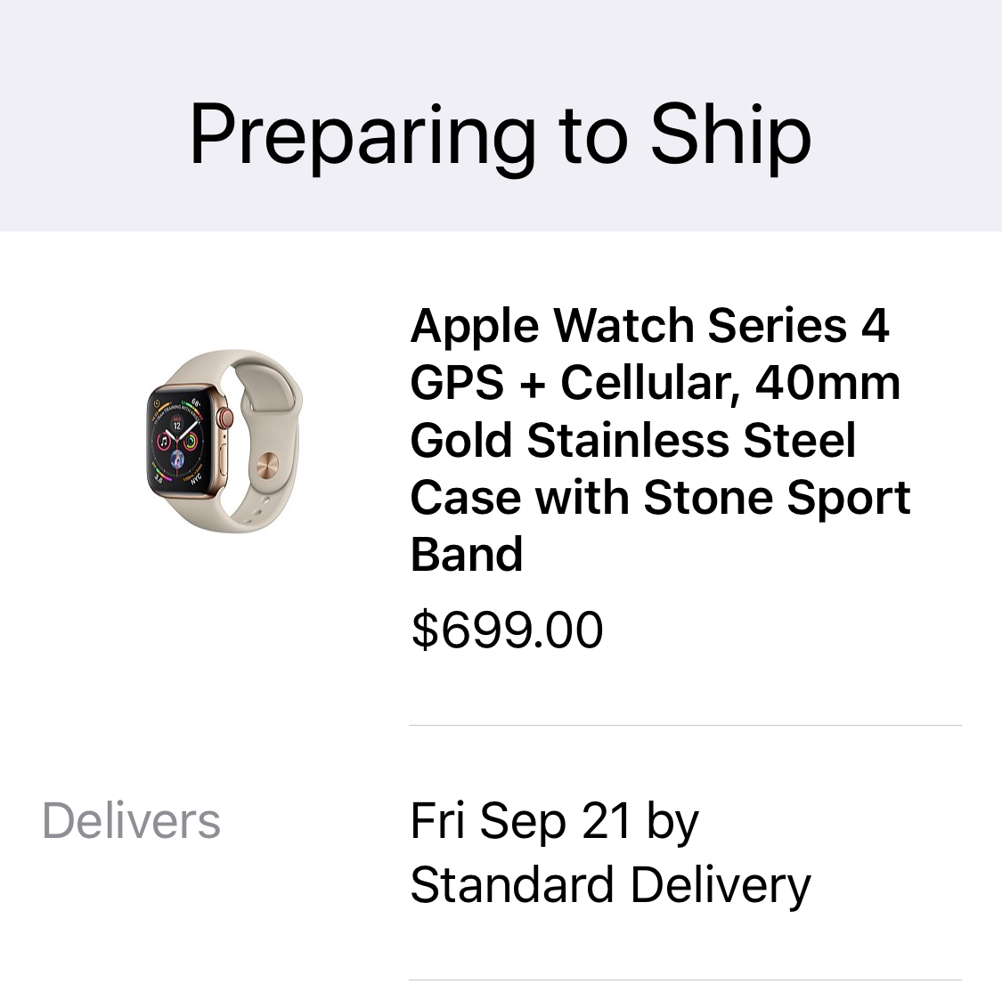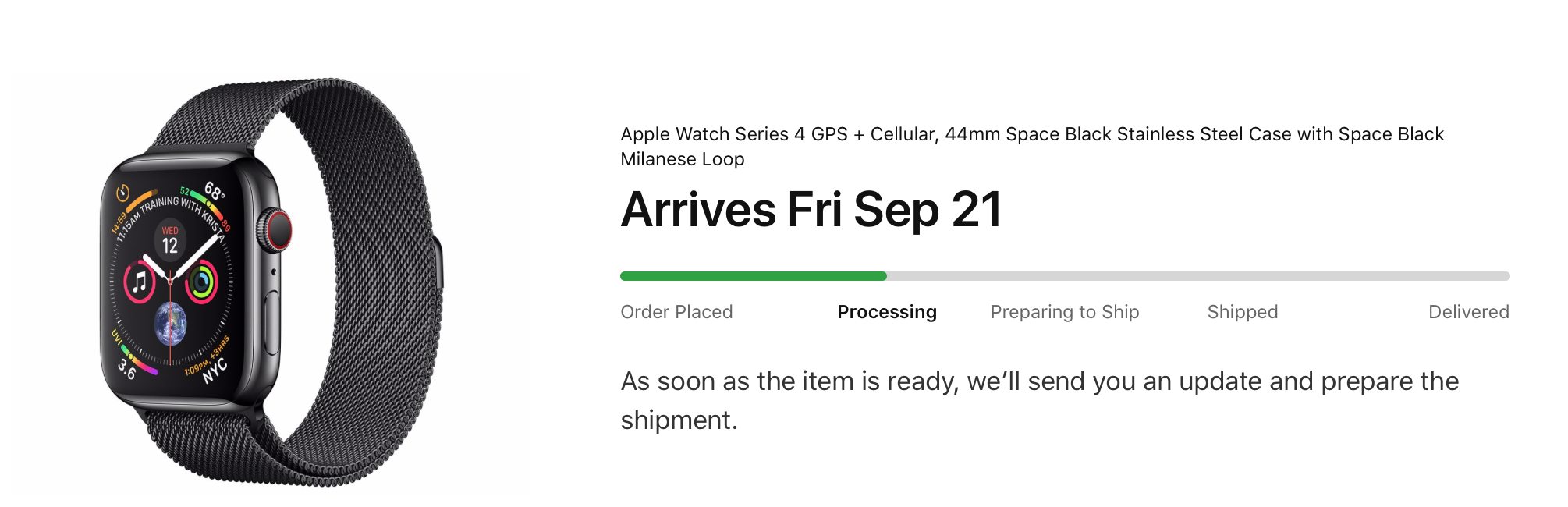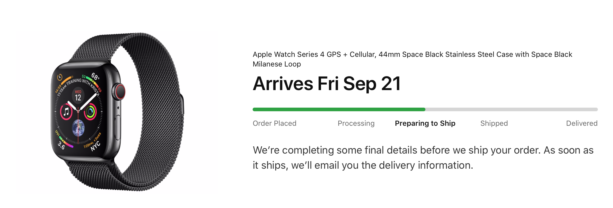 That was exactly what I did the same time as you did (3:11 when I completed the 44 mm SBSS purchase and got the confirmation email). No big deal for 1 week delay for the watch. To me, the phone is the priority.Hi. Completed an order for the iPhone S Max at 3:05. Wanted to get that done because in the past the phones went very quickly. Then ordered a Series 4, 44 mm in space black completed at 3:11 and got the September 28 - October 2 date. Hopefully it will be moved up. It has happened. Fingers crossed.