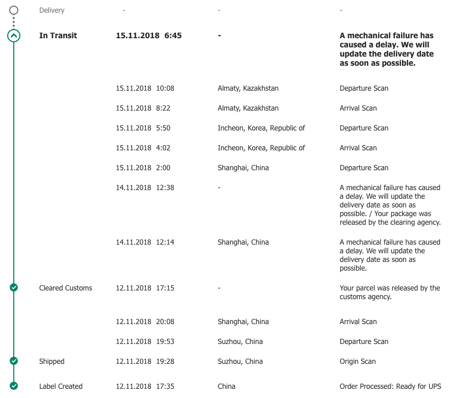 So two mechanical failures, or are they still quoting the first one as the reason for the delay? And I would figure that UPS should know how long it takes them to get a package from one place to another, yet they were still showing an impossible delivery date late last night.