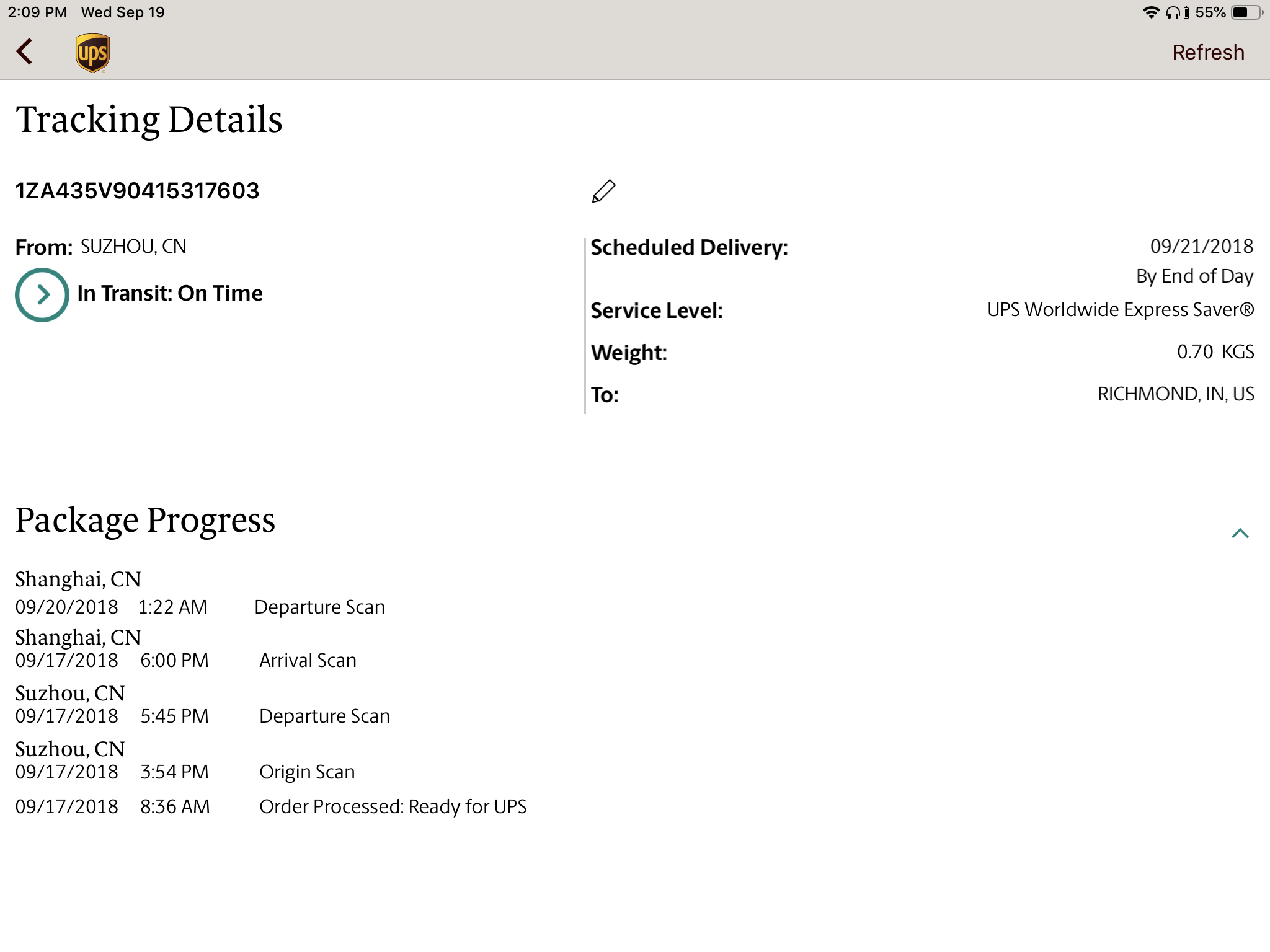 China 09/17/2018 9:38 A.M. Order Processed: Ready for UPS