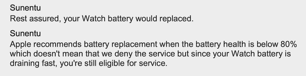 I arranged to send it in, paid £102.44 for the battery replacement. Box sent out, returned to Apple and they have just returned it to me and said in the service notes... "Your watch is operating above 80% of capacity. We provide battery service only for Watches operating at less than 80% of capacity." What happens to those on 80% exactly?