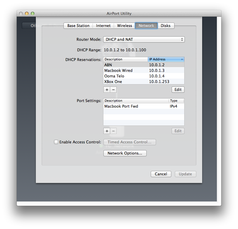 Long story short, a while ago I moved in with some new roommates who already had a latest gen AirPort Extreme as their wireless router. (That's the device I just set up all my DHCP reservations on). However, I already owned, from my previous apartment, my own latest gen Airport Time Capsule. When I moved in I set that up to just "join the wireless network" that the house already had (i.e. my roommate's AirPort Extreme) in order to not mess with the existing setup too much, and since then I've been backing up my Macs to my Time Capsule no problem while keeping everything on the same wireless network. When I did that, in Airport Utility, the Time Capsule (as well as a few Airport Expresses that we have) all showed up as being downstream from the AirPort Extreme, so to speak.