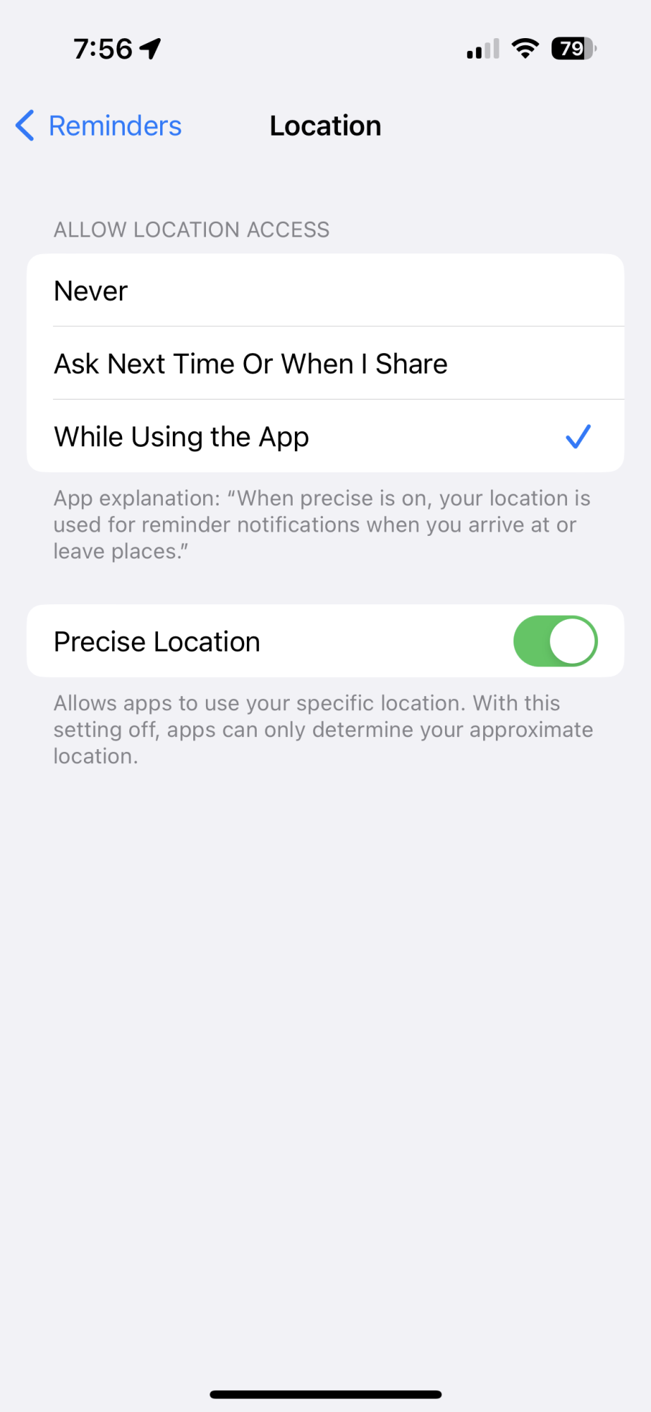 So, guess need to turn on precise via phone. And guess that is why not getting notifications (I don't use location-based Reminders). Seen with other apps (eg. mobile ordering) where I can be parked in front of a business and the app does not recognize I'm there due to precise being off (guess might be setting a block or two over? Same zip-code?).