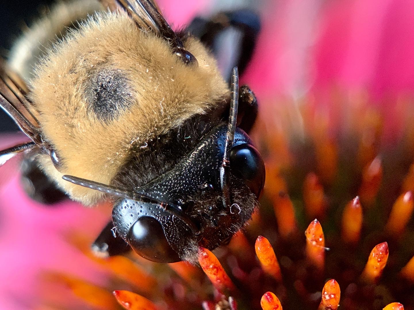 Wow! What app(s) did you use and could you share your process?I used focus stacking app on the phone to take 50 images each and then an app on my MacBook to combine them. Btw: the bee was a dead one I found on a walk so it was easy to pose it in the flower.