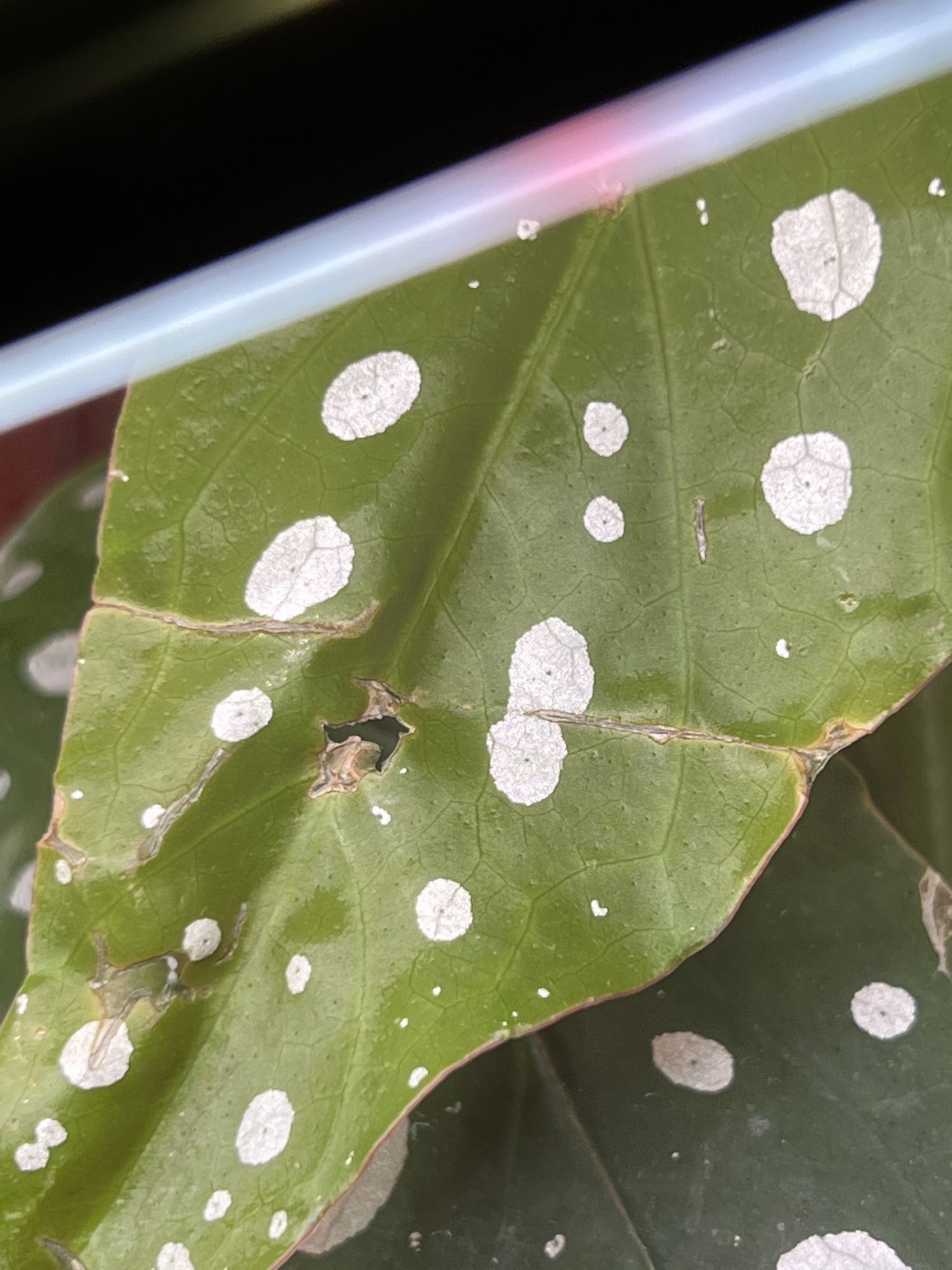Correct on Begonia, the second is Monstera Deliciosa. (This is the only leaf that is bad, I made a mistake early on)Begonia Maculata and I can’t make out the second. Philodendron but not sure species.