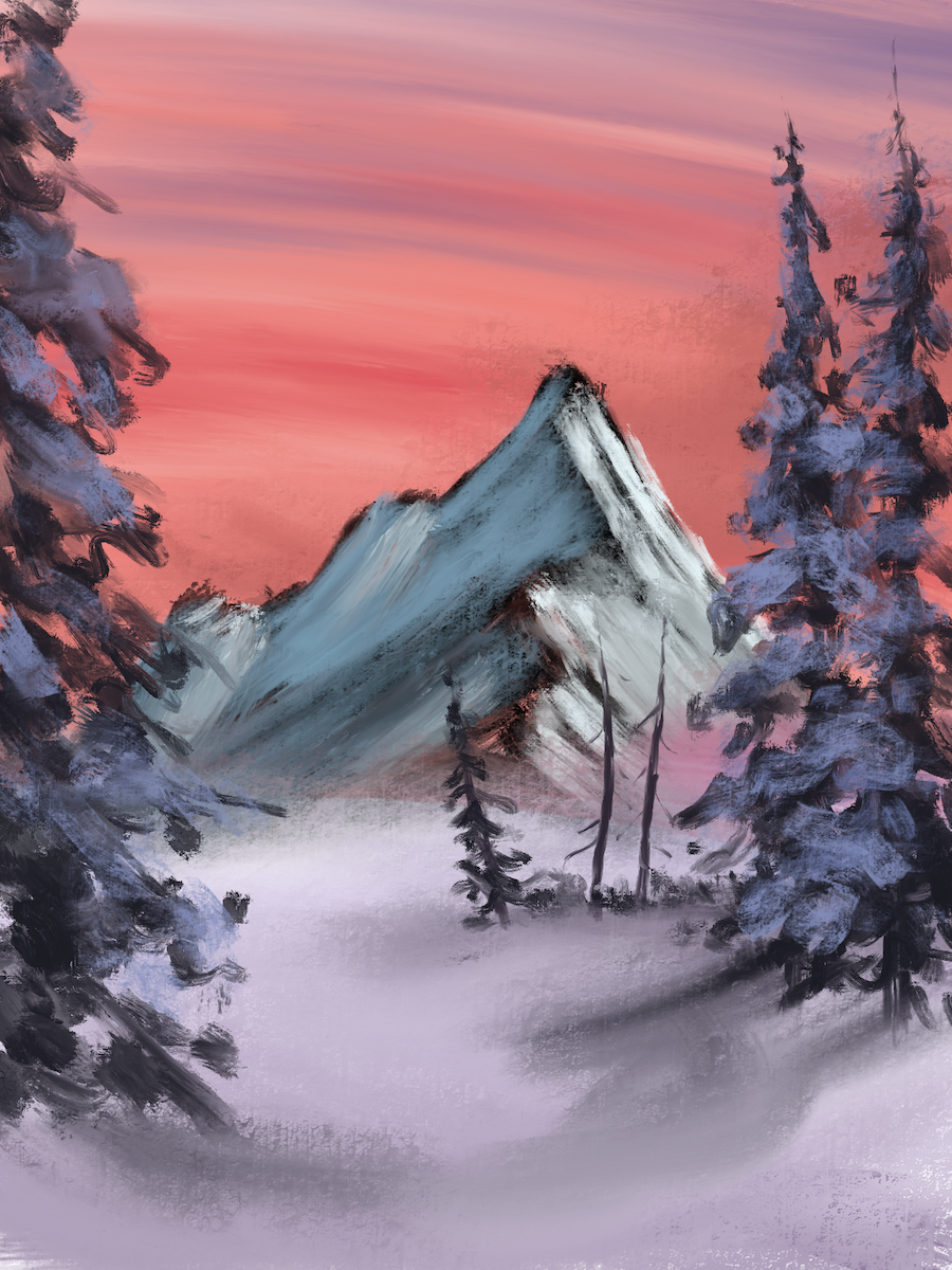 Been a while since checking in here! For fun I tried to follow along on a Bob Ross video. I really need to figure out the procreate equivalents for the various brushes and palette knives he uses.View attachment 744737