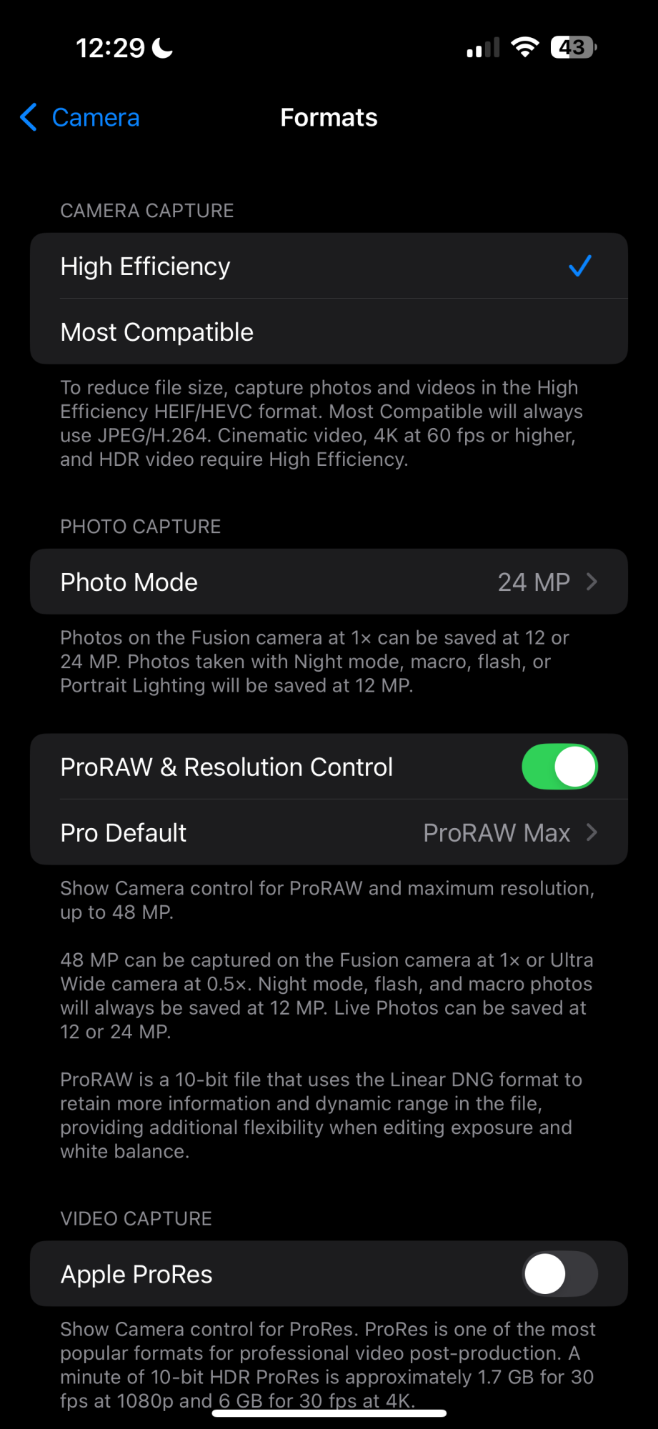 My goal is to capture true to life photos with high quality and reasonable file size. I’m liking the ProRAW Max toggle in the camera app. It lets me choose what quality I want depending on what memory I’m trying to capture.