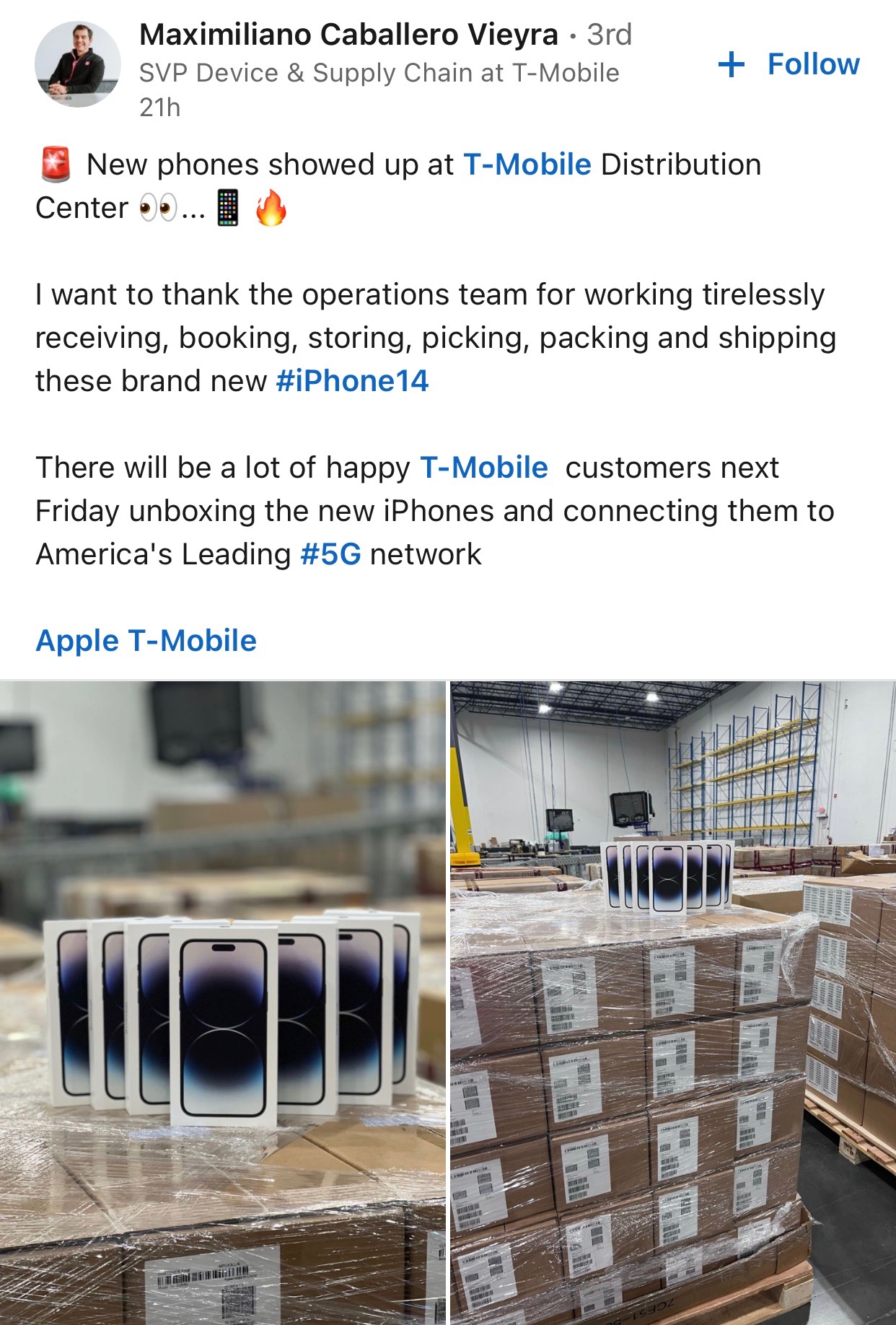 Why would this post be in violation of Apple ?SVP from T-Mobile posted a photo of iPhones in their warehouse...