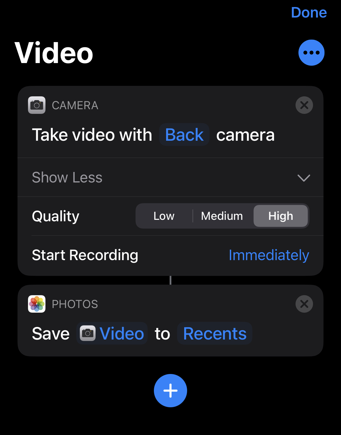 Just now experimenting with Shortcuts, and discovered a peculiar behavior. I created a shortcut to record a video with the default setting of "Start Recording: Immediately" and then it saves it to the Photos app. I also added it to the Home Screen. When I tap the shortcut on the Home Screen, it works correctly. However, if I search for it (by swiping down from the center of the Home Screen) and tap on it from the search results, it does NOT start recording immediately. Am I missing something here or is this a bug? iOS 14.6. See video below: