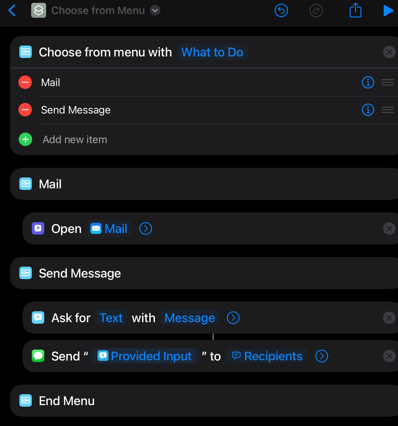 I saw someone use a choose from list shortcut. Can someone help me make that? I’ve made the list in shortcuts, but can’t seem to figure out how to get the list to enact the action I want it to. I’ve googled it and I seem to just have a block on what to do here.