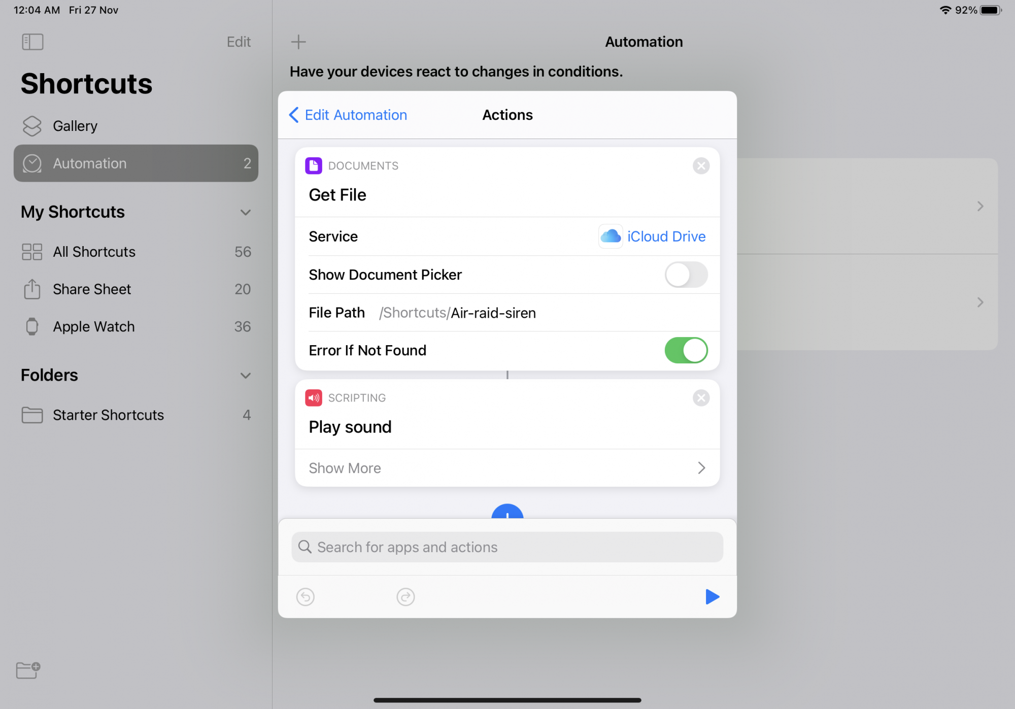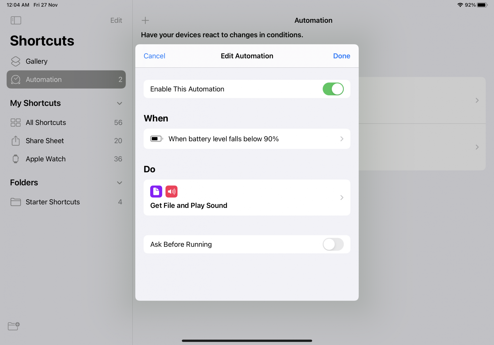 i am looking to have a shortcut on n my iPad which would do the following. when I keep my iPad on charging and when the battery gets 98% charged it runs and alarm ( Custom Alarm) can someone help me with such a shortcut. I am looking out for someone who can make it for me and send it to me ?