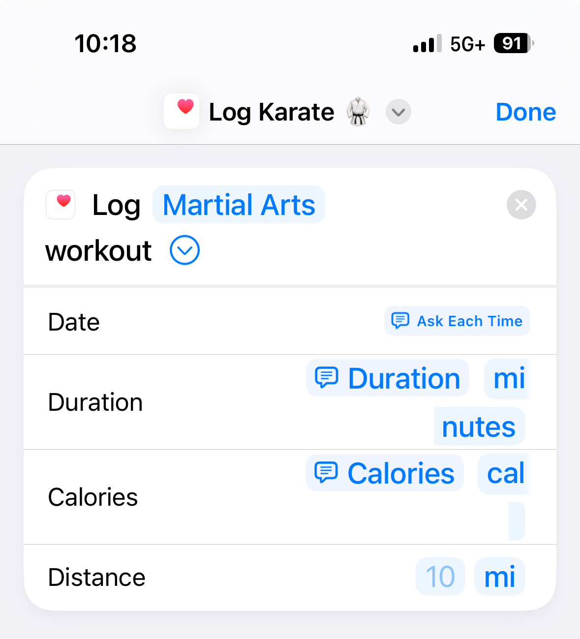 I have crated a shortcut to make it easier, or more streamlined, to log a karate session as I can’t wear my Apple Watch during karate. I have made the simplest shortcut possible to just log a workout with “ask each time” set for the date, duration, and calories. The distance is untouched as that is not used with martial arts.
