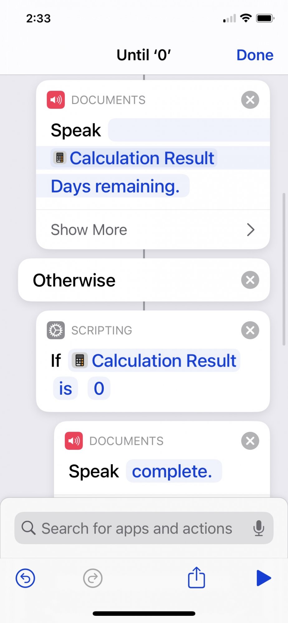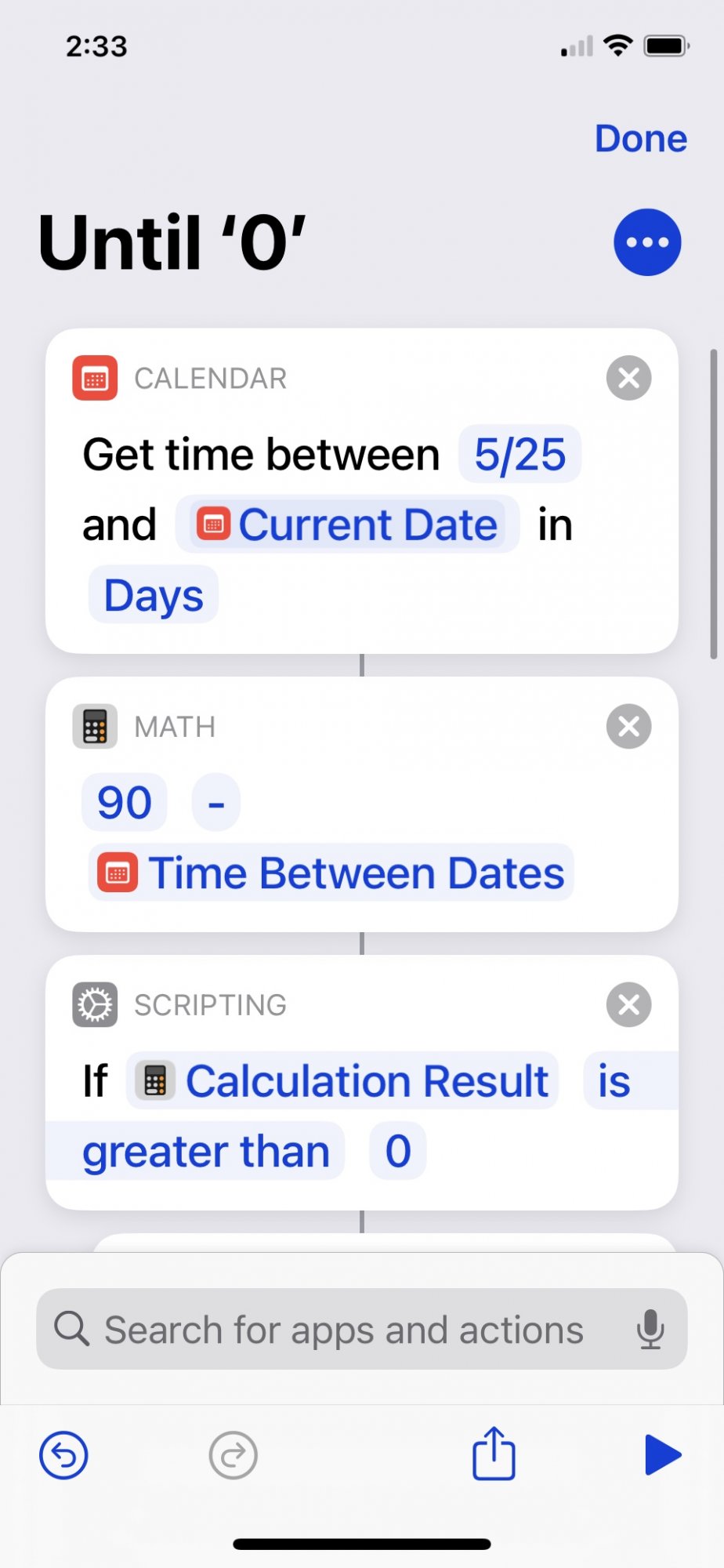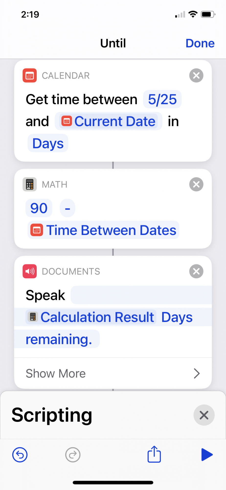 I created an "Until" shortcut that I can add into other shortcuts as needed. BUT the scripting isn't right. I see the 'count and 'calculation' scripts with variables and magic variables containing dates and format for "How long ago/until" but Im not thinking thru the logic properly. ah HELP please!! LOL can anyone help me correct the workflow?