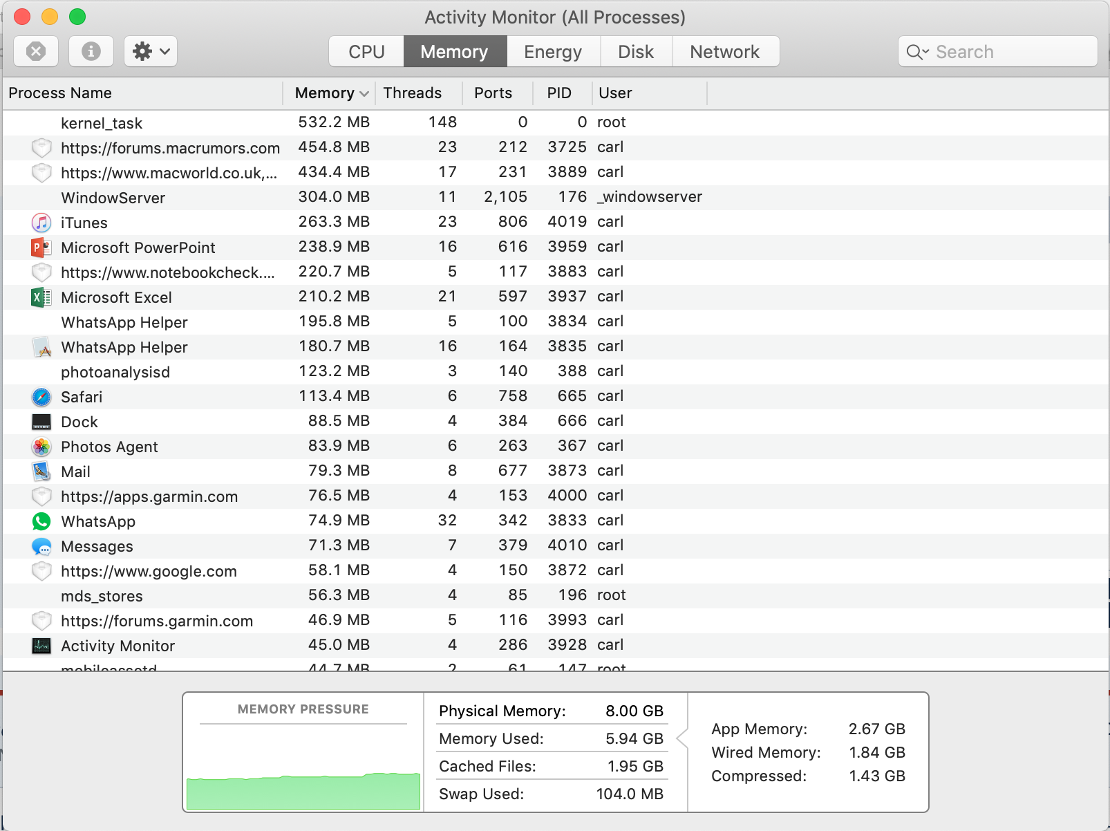 It's interesting to note you're using about 1.5 GB of RAM in Safari alone, with just 6 tabs. You also have a 1.5 GB worth of memory compression.