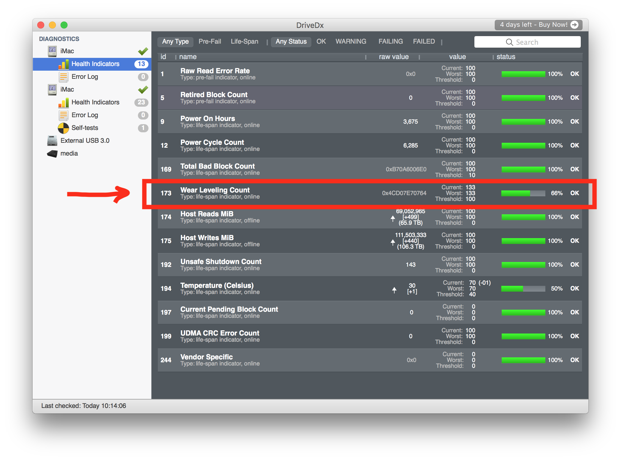 It is saying I have "66%" left on my Wear Leveling Count -- which seems a lot more in line with what I'd expect from an iMac that has seen less than 3 years of pretty typical home office use.