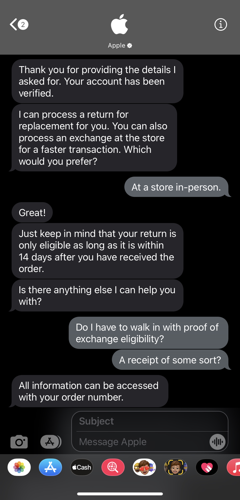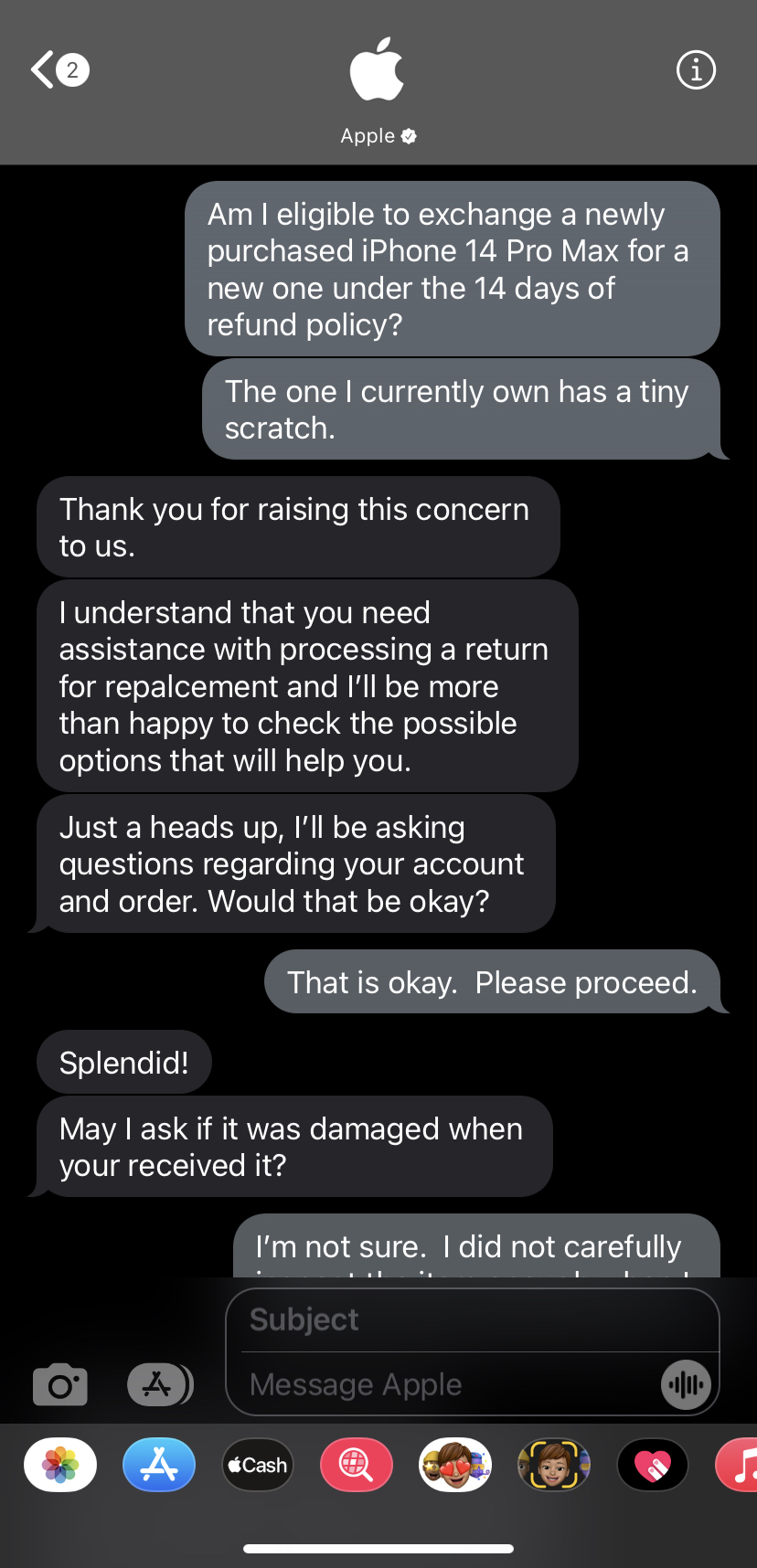 Below are attached screenshots of a conversation I had with an Apple specialist via iMessage. This person stated I could have the possibility of exchanging the phone for the exact same model in perfect pristine quality.