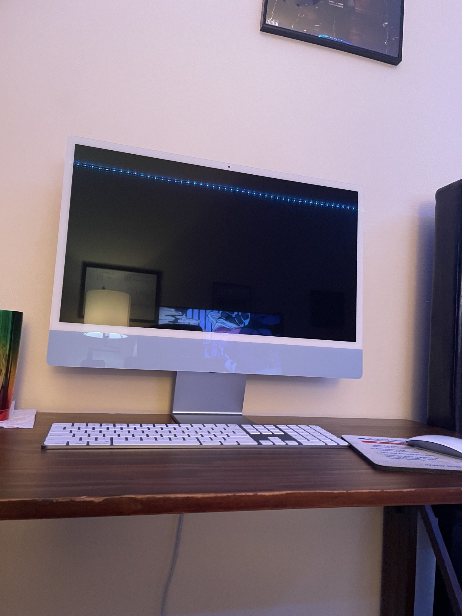 Green with white bezels almost disappears in a natural setting. I expect blue would too. Forgive lack of cord management. I have a grommet behind the computer, but requires taking drawers out, so haven't done it yet. First 3 photos are at night and last one is during the day. Don't laugh....but yes, my upstairs office is my bath vanity and I do get a lot of work done there with my morning coffeeView attachment 1779420