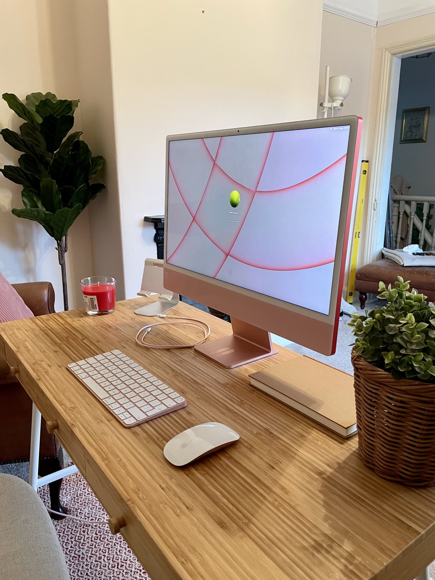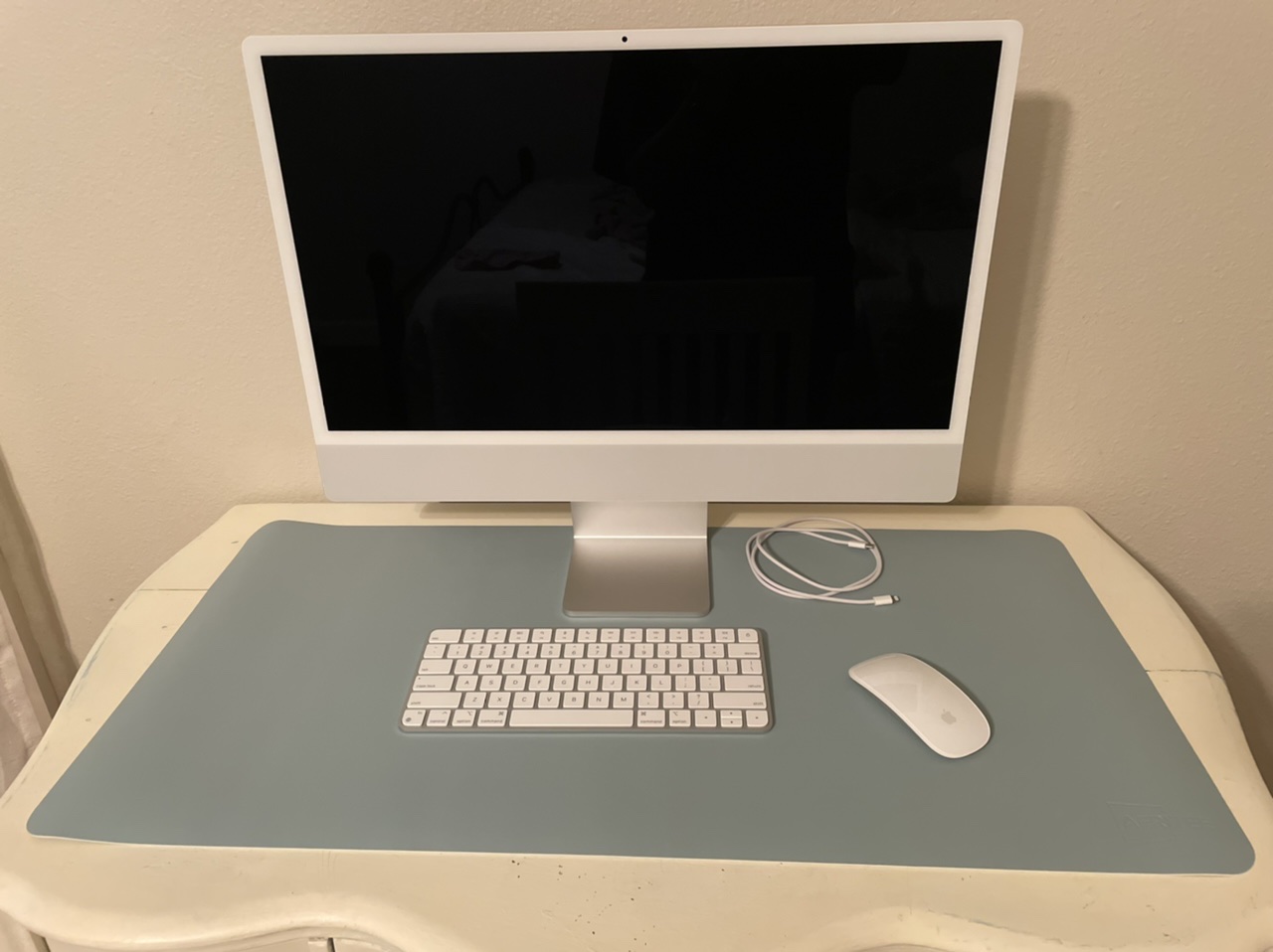 Nice! ... curious: what does the silver iMac screen look like in dark mode? How did you fix that ... mini horse drag around the rotation of the picture?Not as fancy as some of your setups, but I did get my desk mat today, and I really like it! I figured since I couldn’t commit to the blue iMac, I’d get the blue pad. ;-p