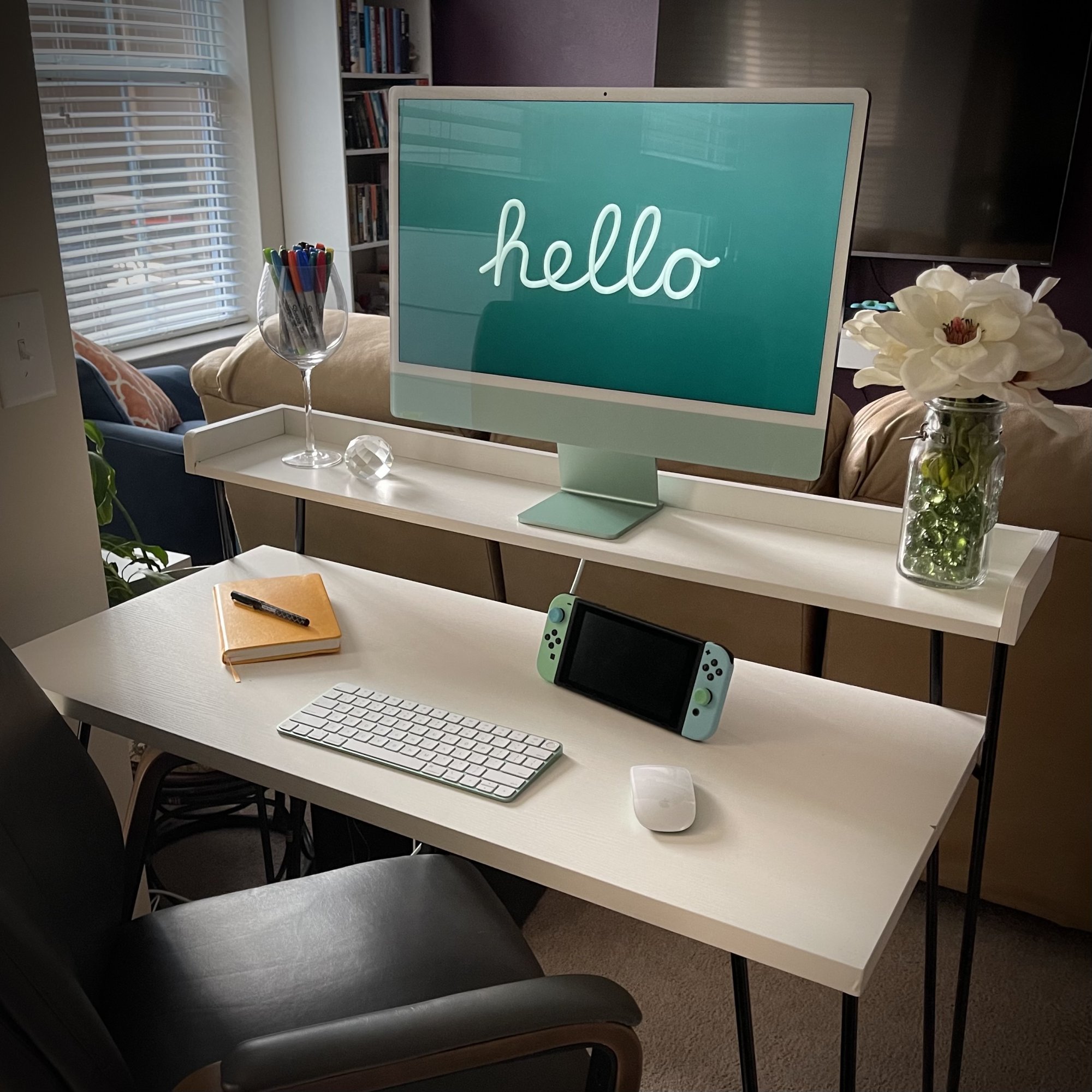 Love your setup! Where did you get the desk/tables?I'll admit, I cleared my desk and added decorative items (and my Nintendo Switch, since they match) just for these photos. But one thing that's great about my setup is that I get to see the back of the iMac.