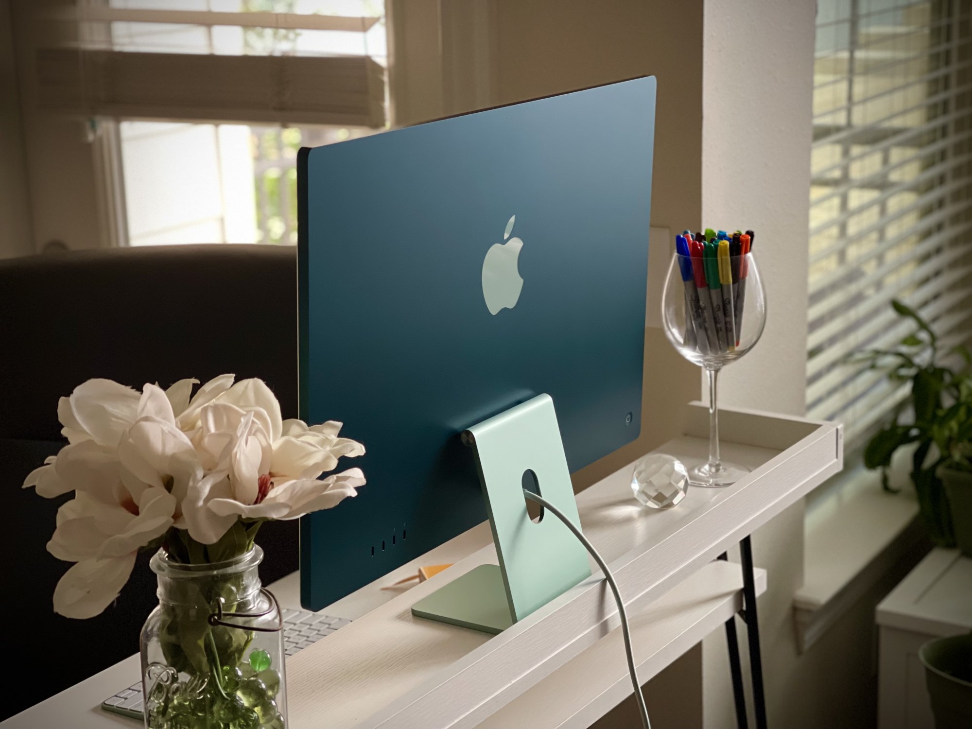 Beautiful! I ordered the blue but I'm thinking the green looks even better. Evocative of the original Bondi Blue color of the G3 iMacs.I'll admit, I cleared my desk and added decorative items (and my Nintendo Switch, since they match) just for these photos. But one thing that's great about my setup is that I get to see the back of the iMac.