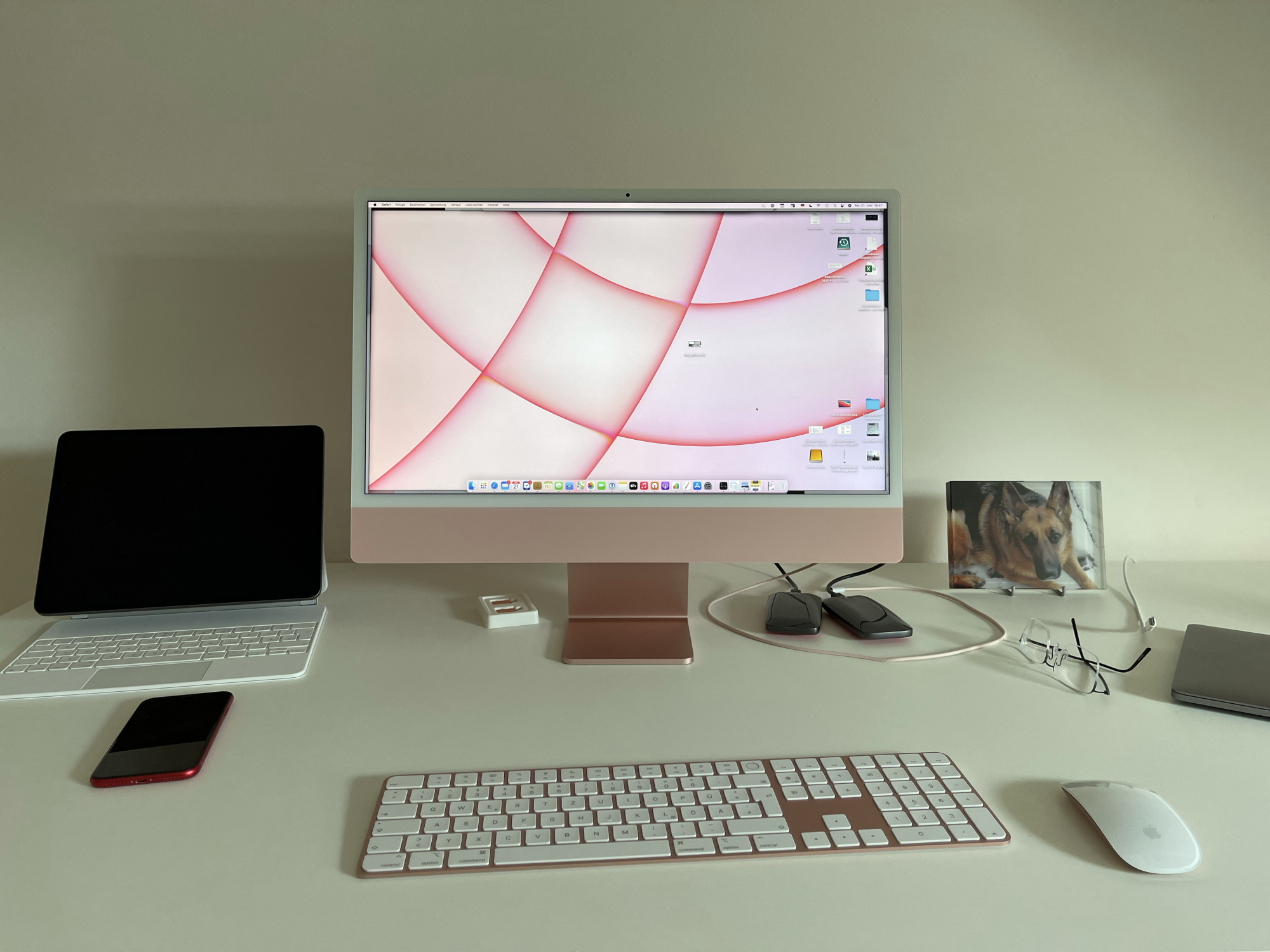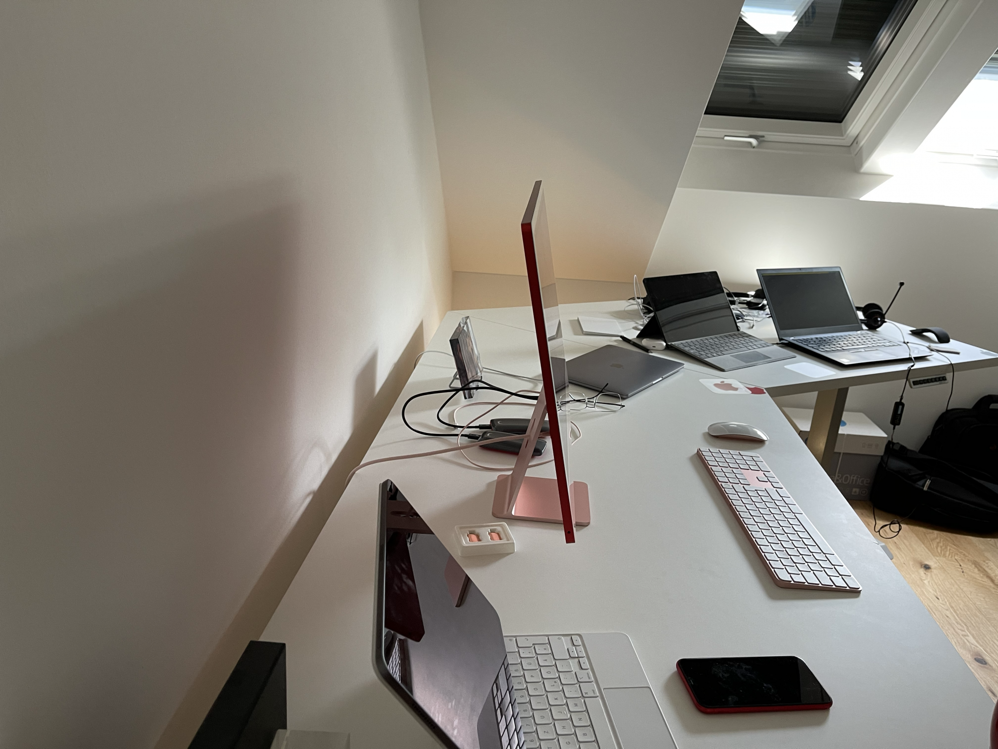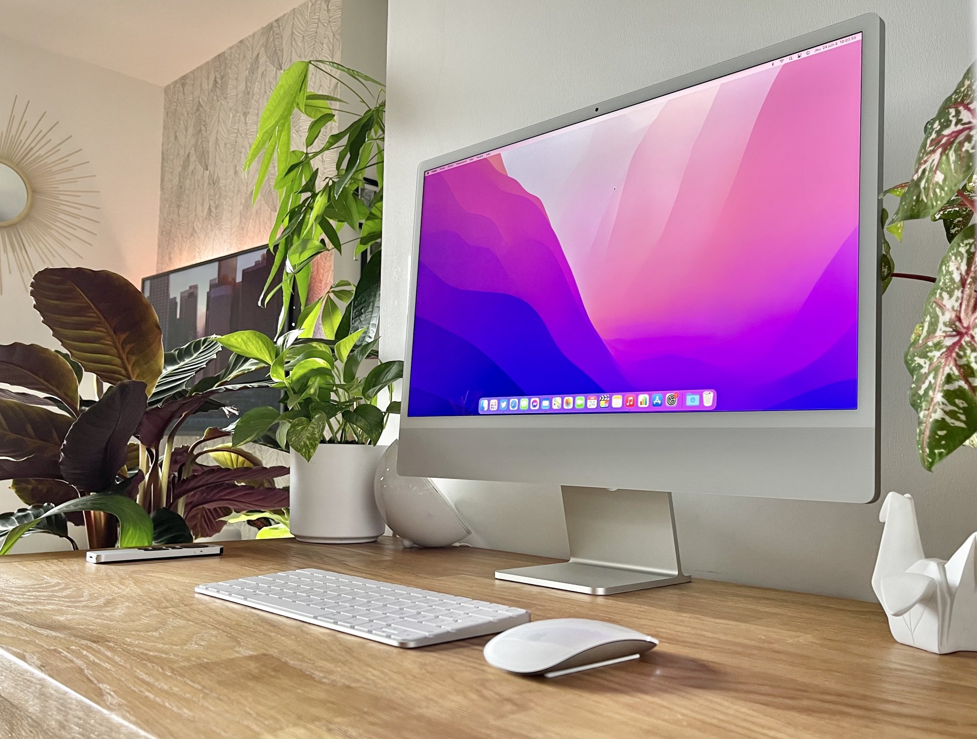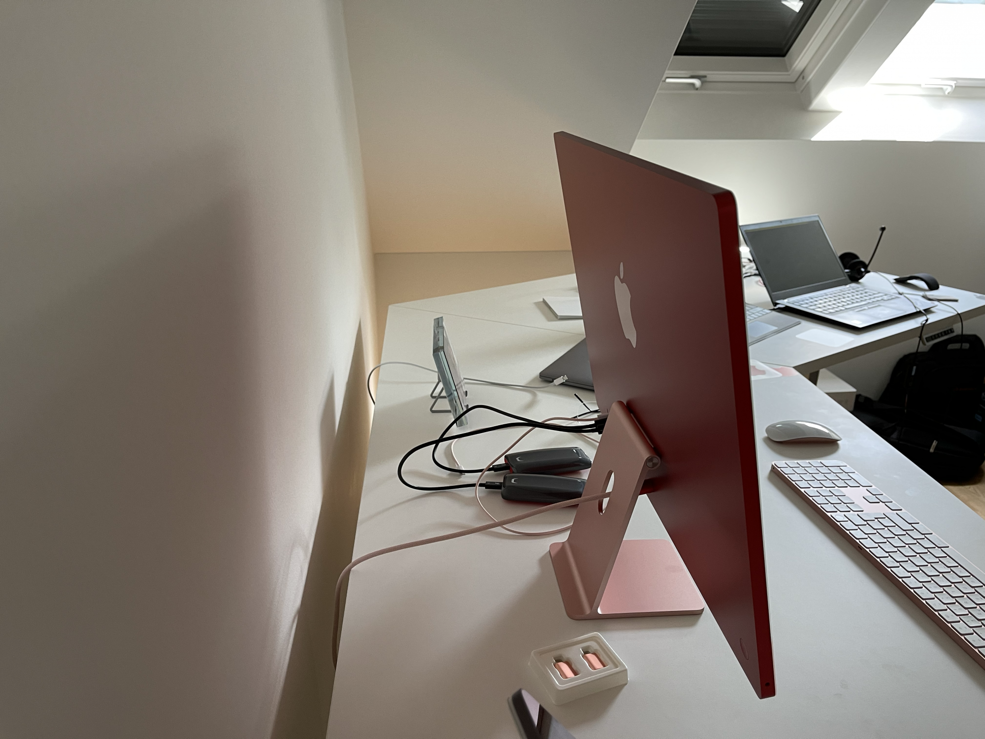 For years we were used to it, but seeing them side by side the black bezels of the old 27 are really jarring whereas the bezels of the 24 blend with the silver chassis and the room in the background. And given the way the light bezels reflect the ambient light of the surroundings I suspect it would work just as well in a darkened room. To that end I wouldn’t be at all surprised if the forthcoming bigger iMac, meant as the actual replacement for the current 27, has light coloured bezels. I suspect it would work just fine with either Silver or Space Gray although I’m sure quite more than a few heads around here would still explode.
