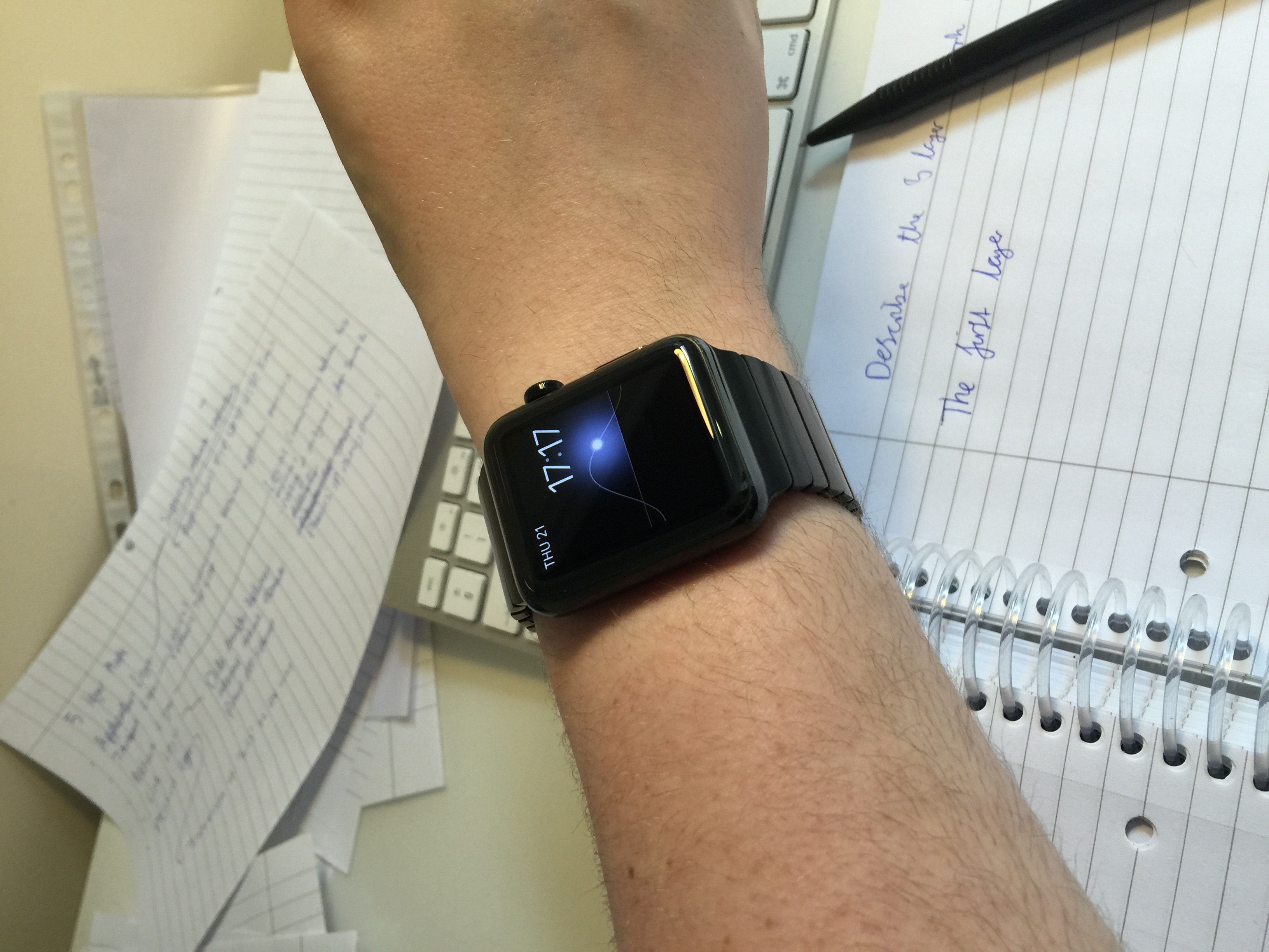 Some Space Black chillaxin-action.... Just got my super comfy leather loop today. Key to my choice of this band is spending most of my time on a MacBook Pro, and saving the finish of the band, the laptop and my eardrums from the scraping sound of metal on metal....