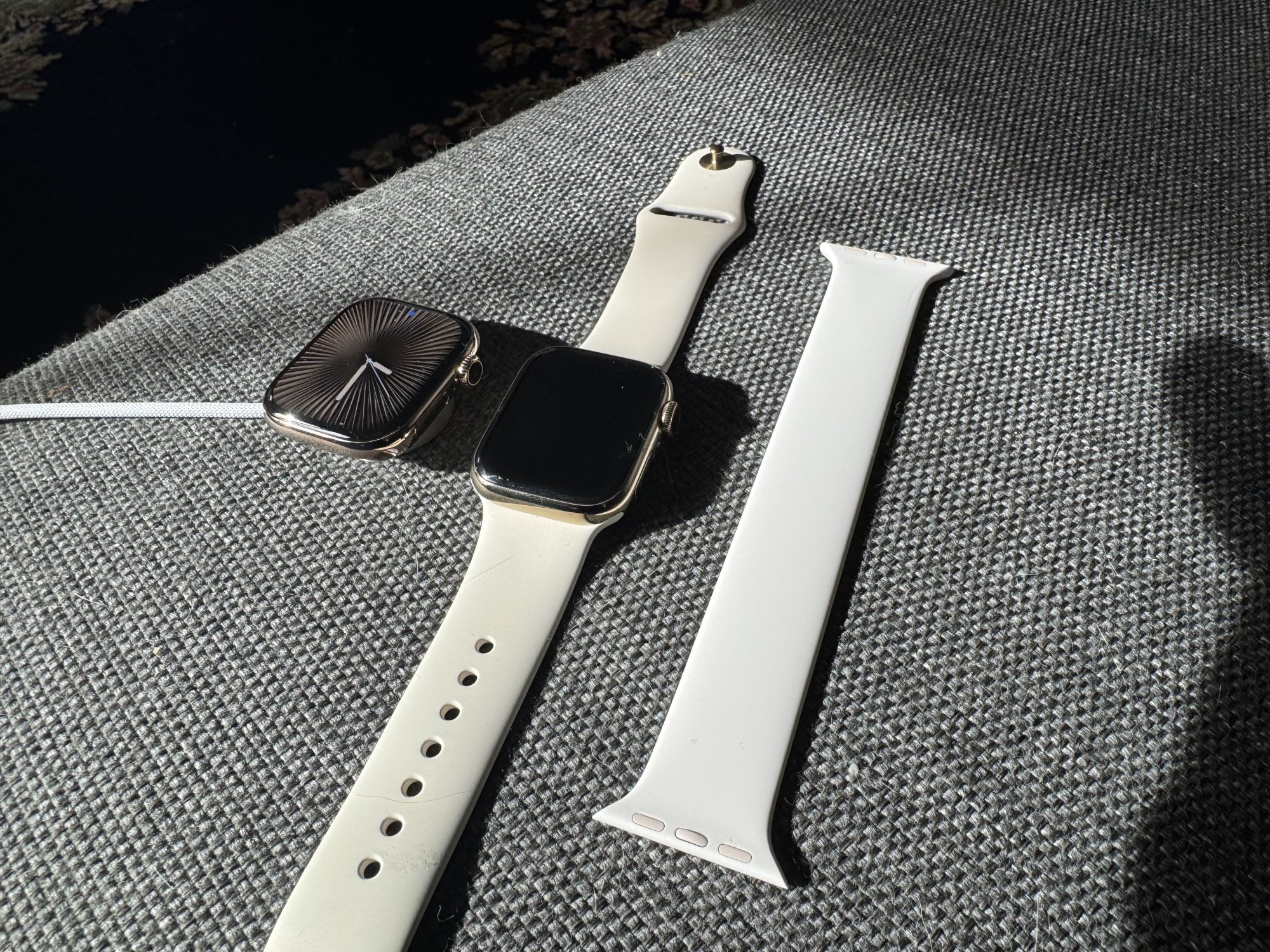 My light blush solo loop literally just arrived with my new gold titanium, so not exactly what you’re looking for, but I hope this helps a little bit! Left to right are the new gold titanium 41mm on the charger, my older gold stainless steel S8 on an antique white sport band, and the new light blush solo loop.Does anyone have the Light Blush Sport Band, possibly with a SS or Ti case?