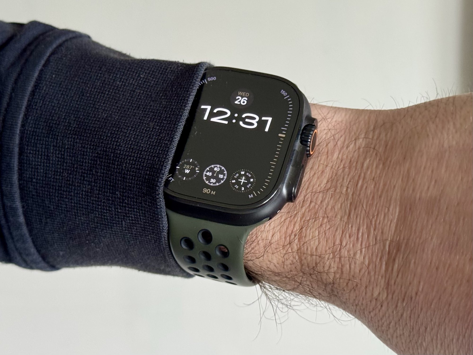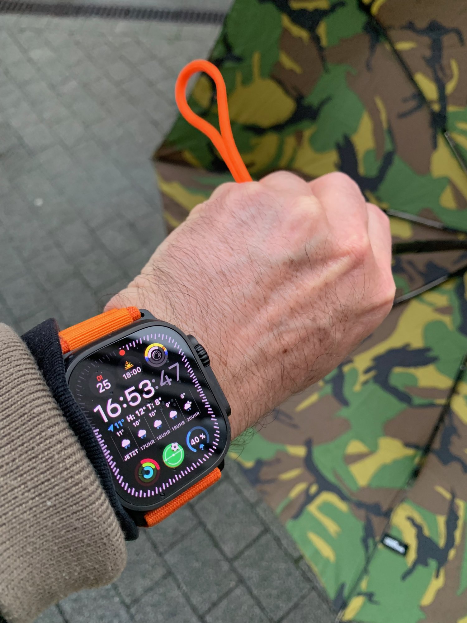 My Apple enthusiast friend has this same band on his 44mm Apple Watch Series 6 in space gray GPS. Is it cargo khaki and black? It also looks great on black Ultra!Black Ultra with a bit of a tactile feel. This type of look with the watch face suits far more on the black vs the natural finish I feel.