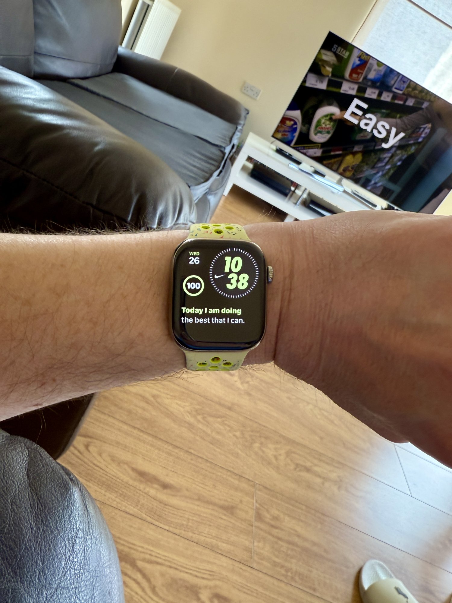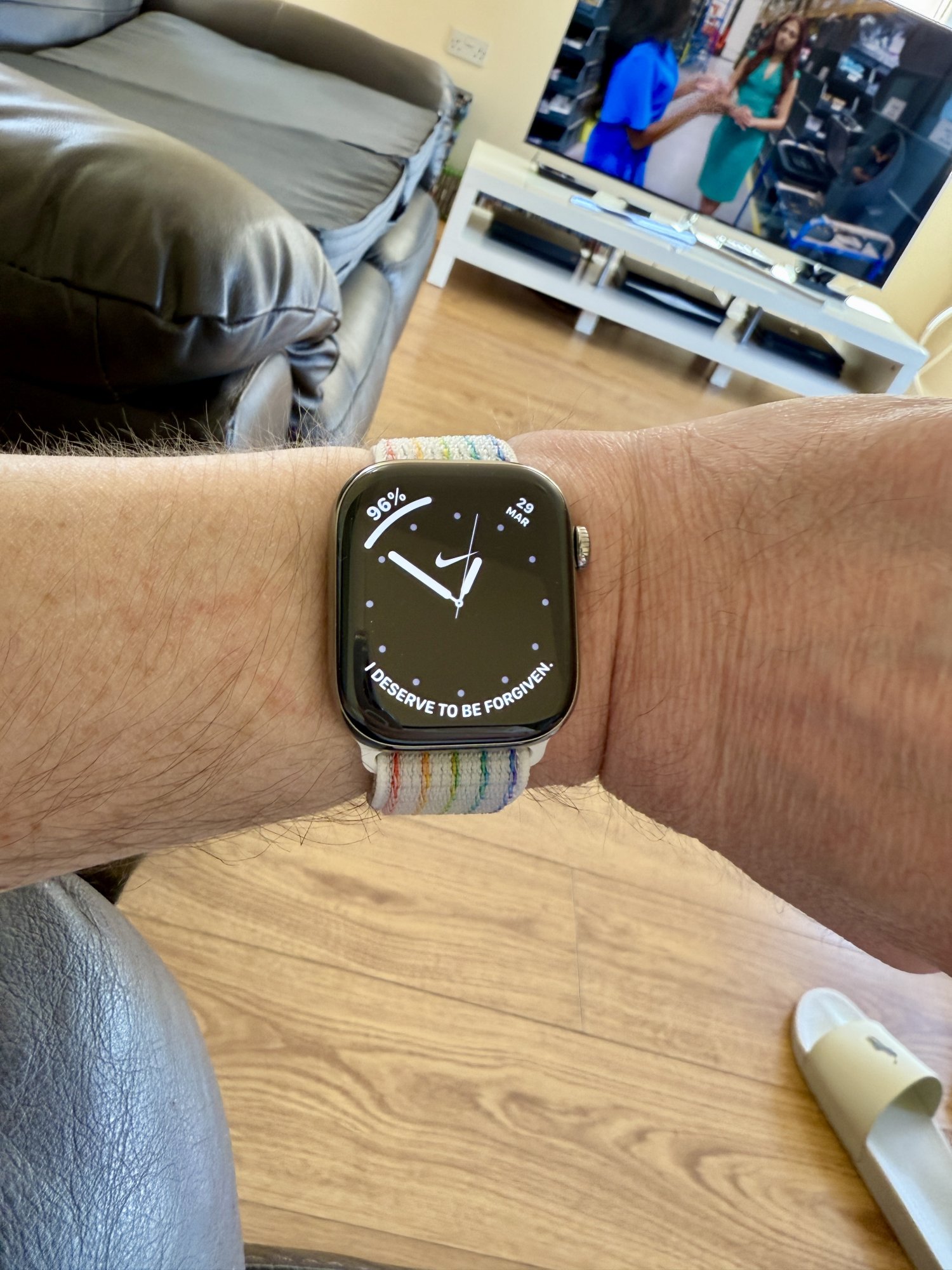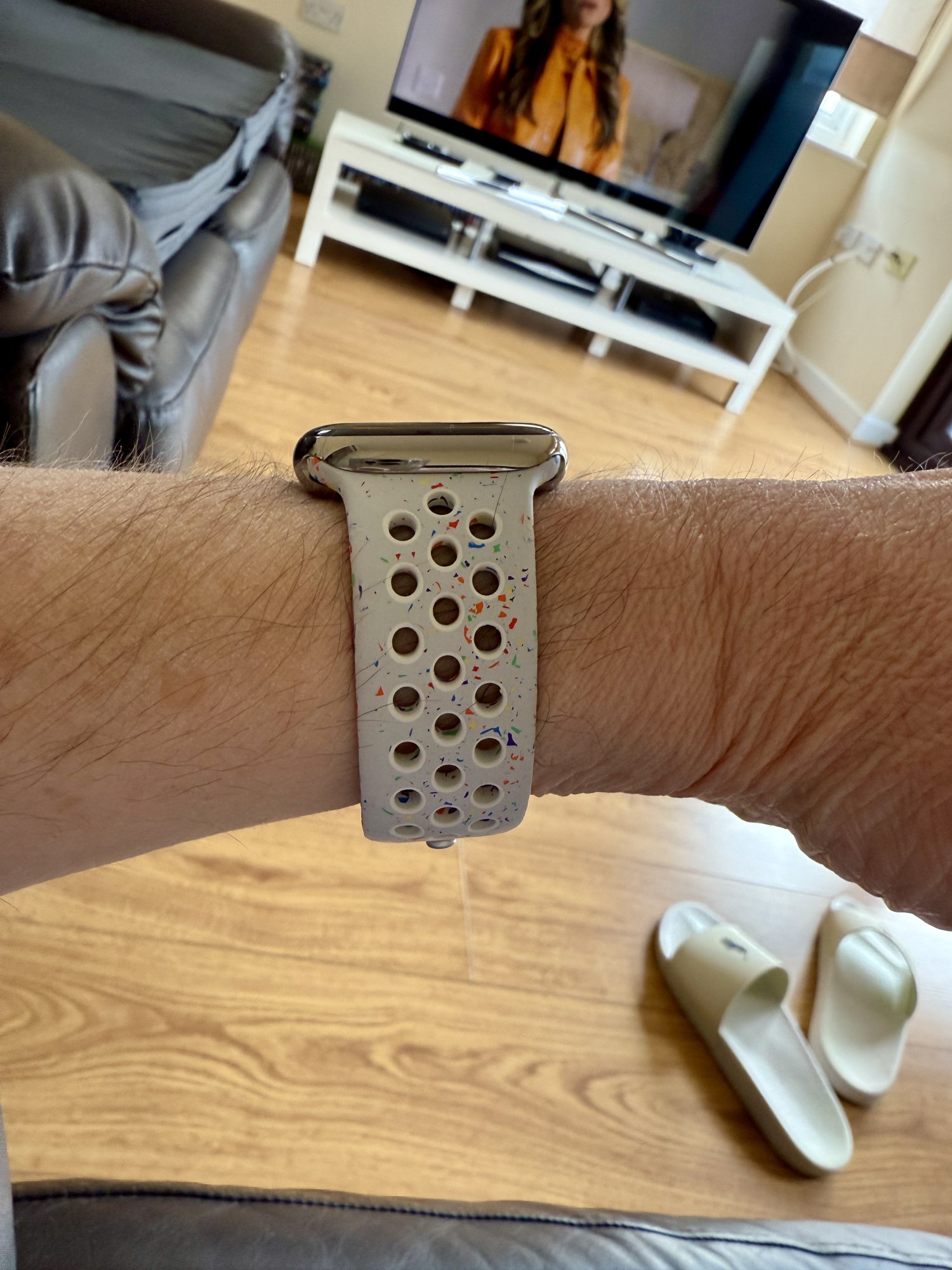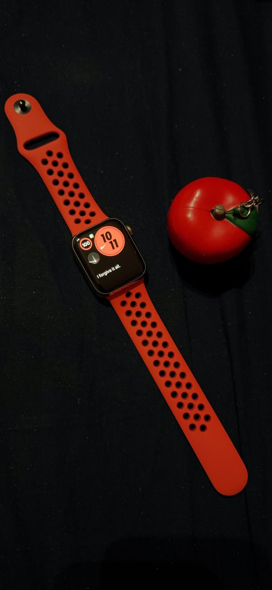 Nike Sport bands I like my gym red and bright crimson and other colours I am looking forward to next are bolt/black, Magic ember and crimson bliss, and the one that my Apple fan friend has on his Apple Watch Series 6 44mm space grey, the olive grey and cargo khaki.