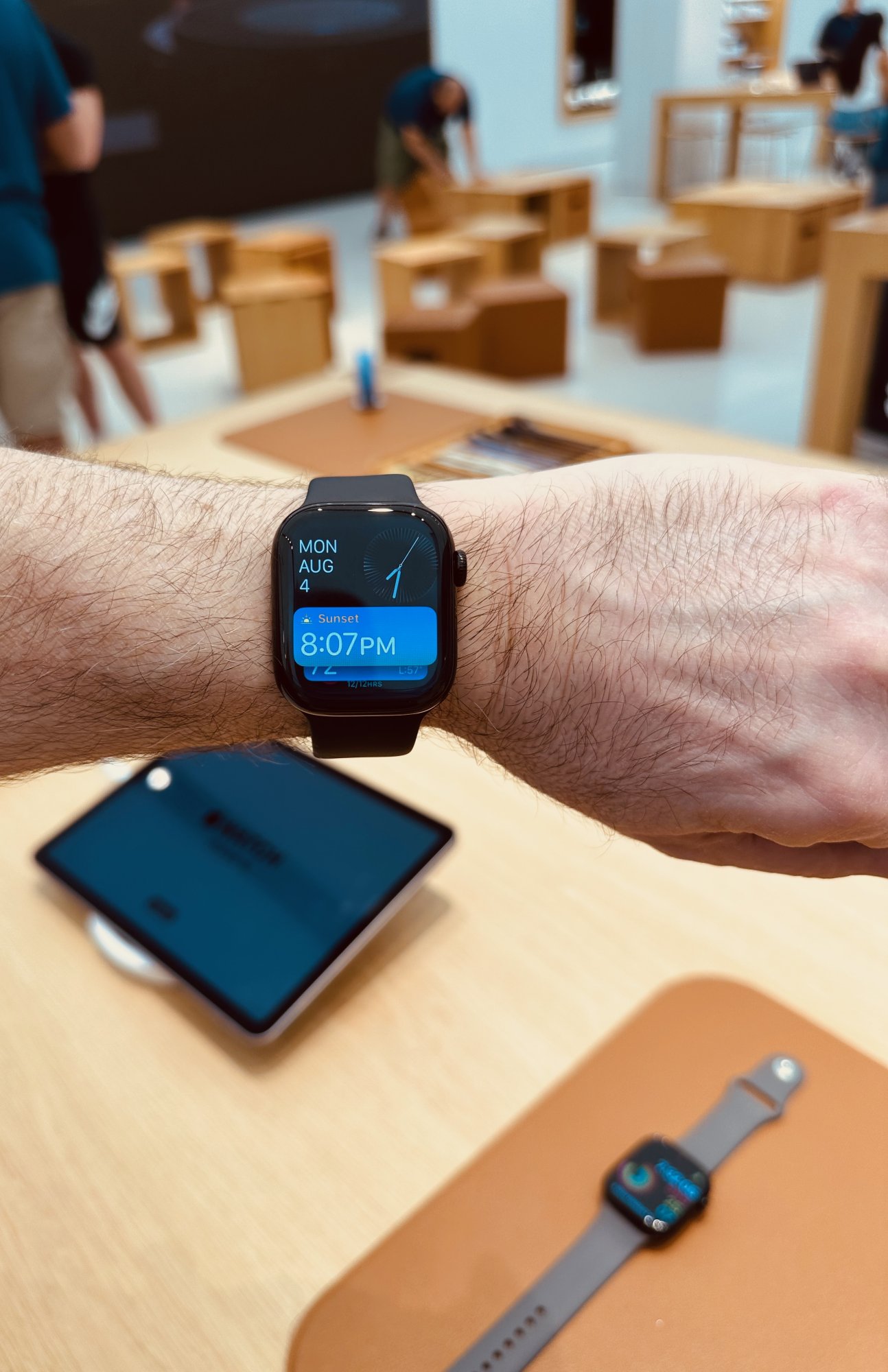 46mm Apple Watch series 10. Looks good on bigger wrists.I tried on two watches today, and I am requesting opinions regarding watch size. Which size do you think looks best? Please disregard all aspects of the bands, blurry pictures and color differences. I asked someone to snap them for me. The future Mrs. DC
