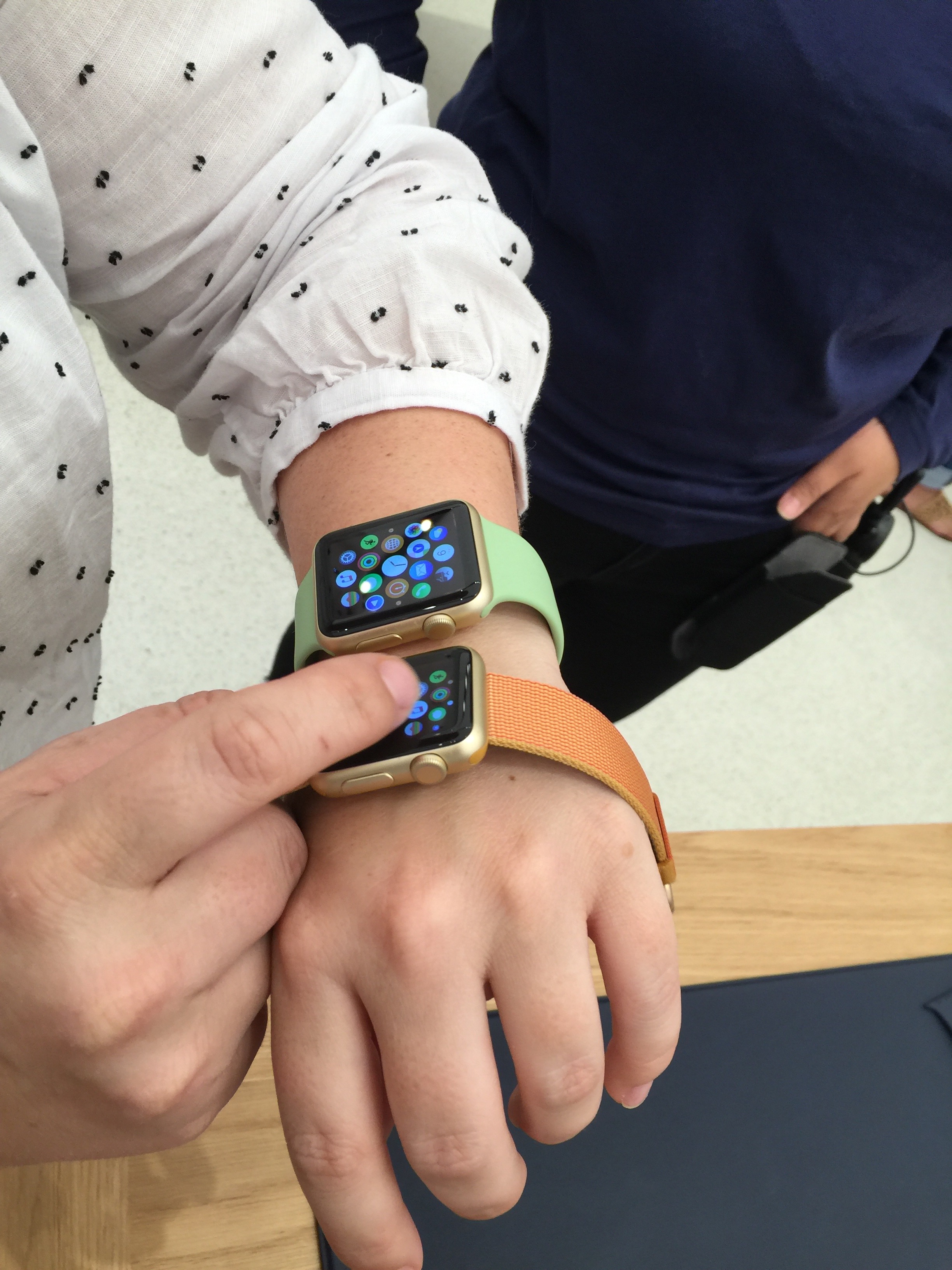 I went into Apple to try on both sizes before placing my preorder. I really wanted to love the 42 but I thought it was too big and clunky. The 38 felt right and looked more like a traditional watch, instead of a big tech gadget on my wrist. I think the modern buckle makes the 38 look larger and the sport band makes it look smaller.