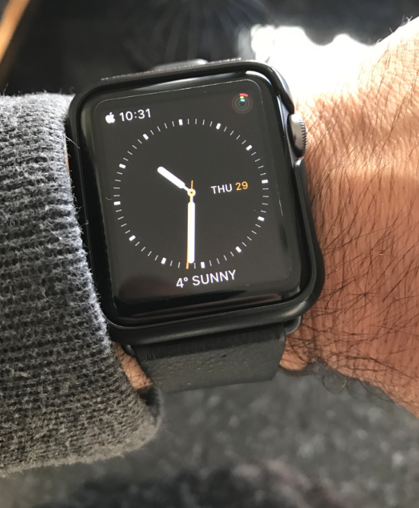 My 42mm Space Grey, with a black cover and a Belkin leather strap: