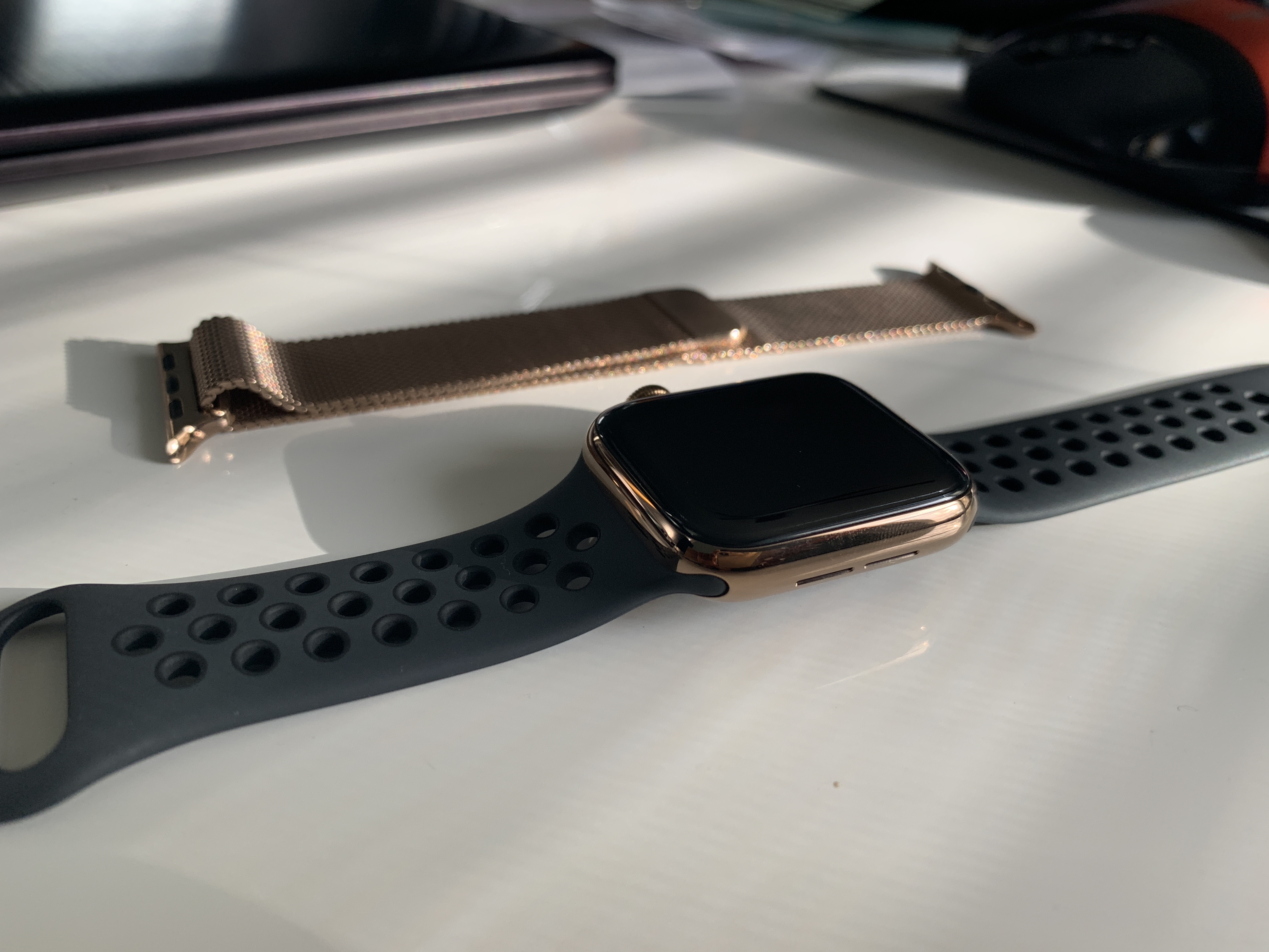 Looks nice - both the rose gold and the black. I'd like to know how they wear and how well the color/finish endures.Also picked up a black stainless steel band on eBay with the release buttons like the Apple band. It was $48.88 - https://www.ebay.com/itm/1-1-Stainless-Steel-Bracelet-Strap-Band-Link-For-Apple-Watch-Series-4-3-2-1/132644324647?ssPageName=STRK:MEBIDX:IT&var=432091554932&_trksid=p2057872.m2749.l2649. Seems to work well with the 44mm SS gold Apple Watch 4.