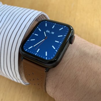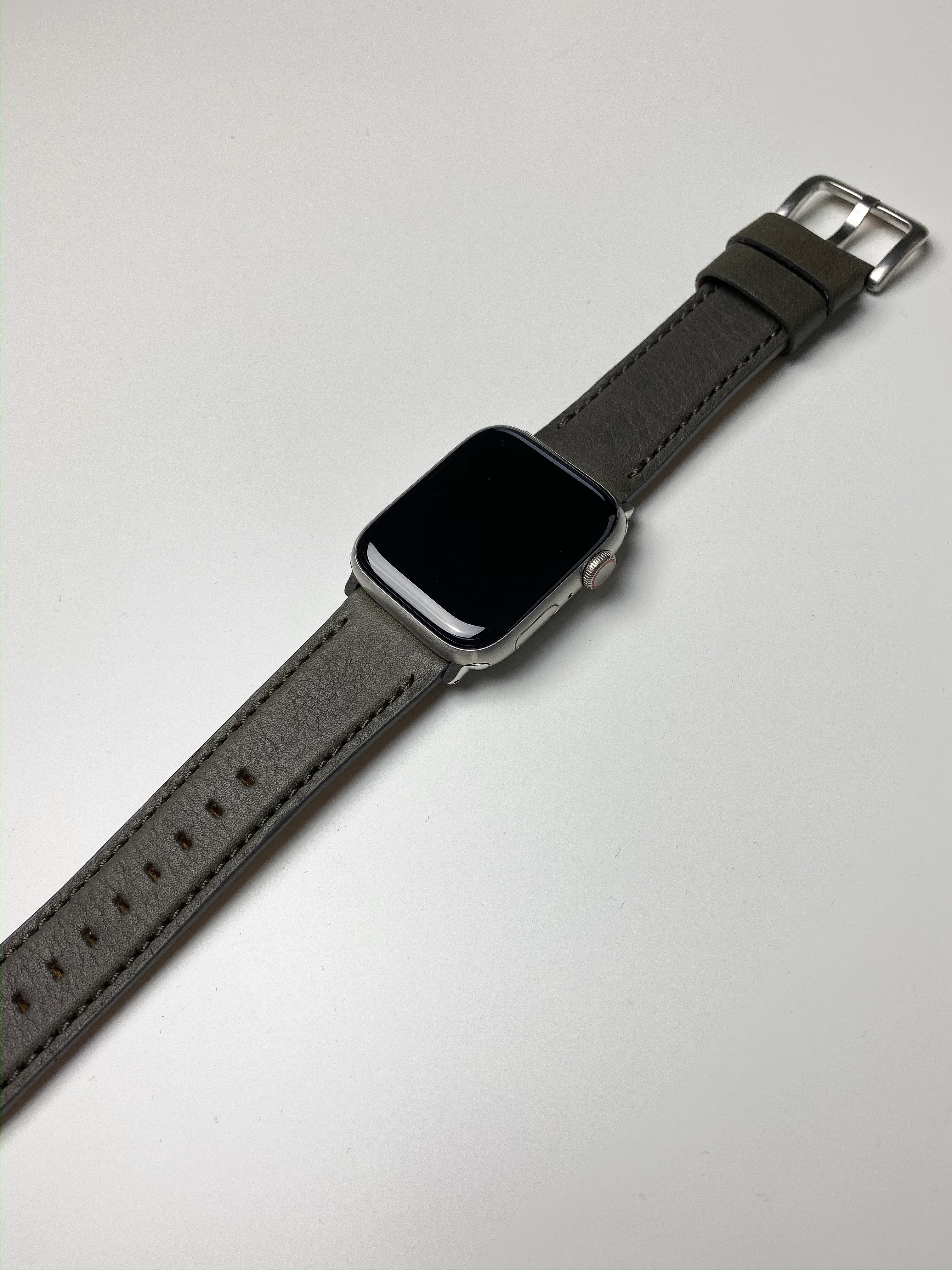 It’s the standard titanium case and the band is from Shinola. They have some online but in their stores they can add the Apple Watch mechanisms to any leather band.