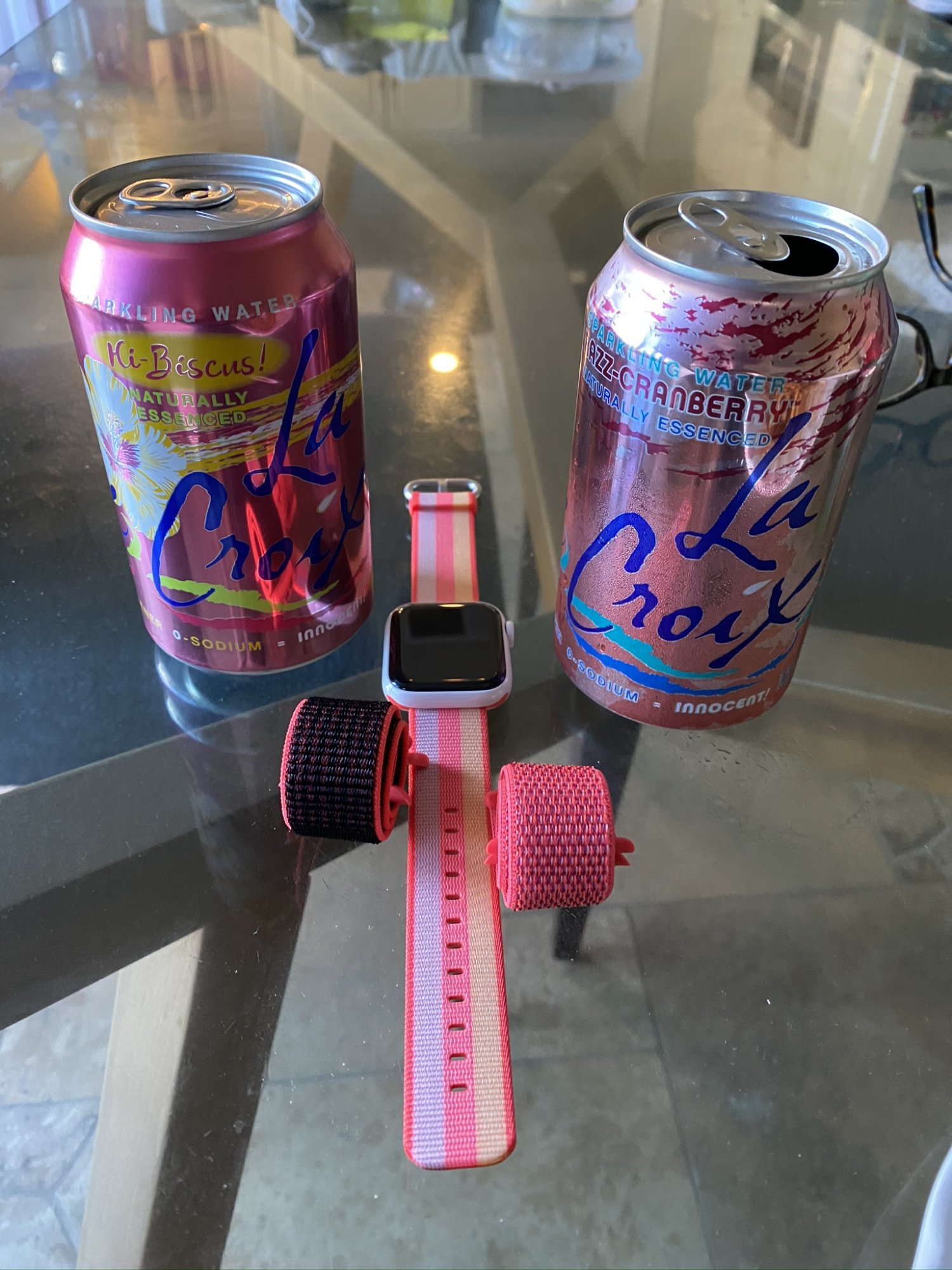 Ugh I can’t get the picture to fully load if I click on it, but those la croixs look so refreshing 🤤 my hibiscus look way more red, I swear.It’s mostly the silver shimmer in the “soft pink” left chunk...it has to be seen. The yellow is also golden like no yellow sport band is, and the middle “red” pops way above any pink or dragon sport band. A little less intense than the hot pink sport loop I just found..but it also carries the soft pink pattern over...tomorrow! Here’s some reference bands...bright crimson and hibiscus