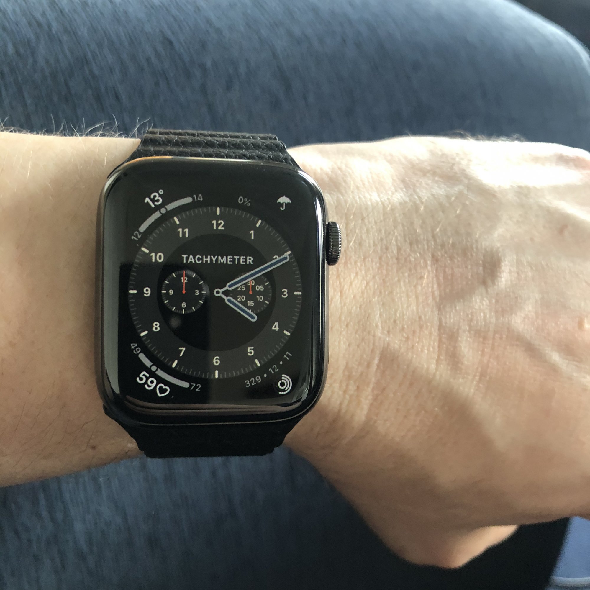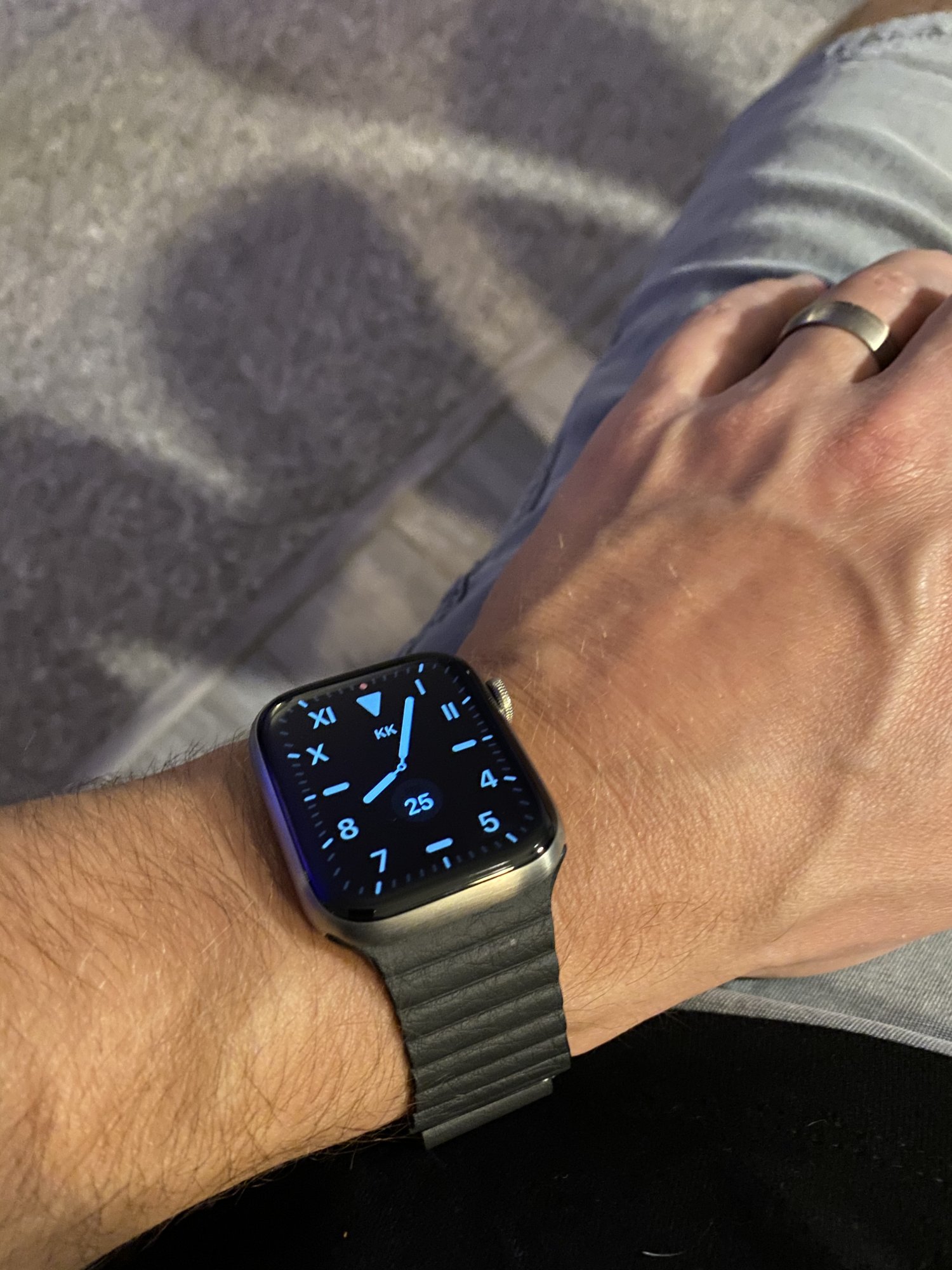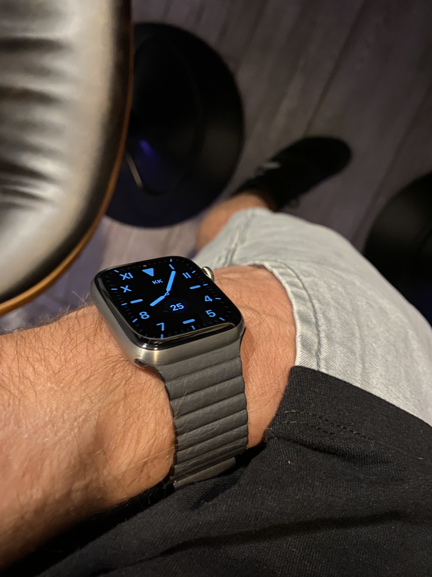 Stainless Steel Graphite with a third-party copy of the Apple Leather Loop. The always-on display on this thing is super bright and easy to read.