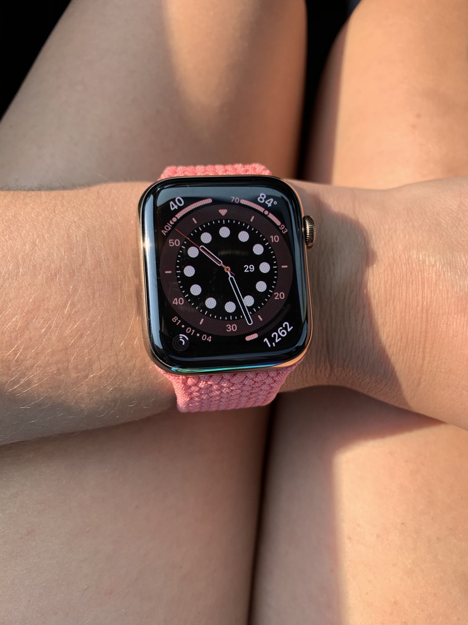Think it’s just the sunlight. It looks brighter in the sun and with certain bands, and when it blends into my warm skin tone it doesn’t look as dark either. I’m curious to see the new 6 gold!Was series 5 gold lighter than series 4 (which I have)? Or is it just being in bright sunlight?