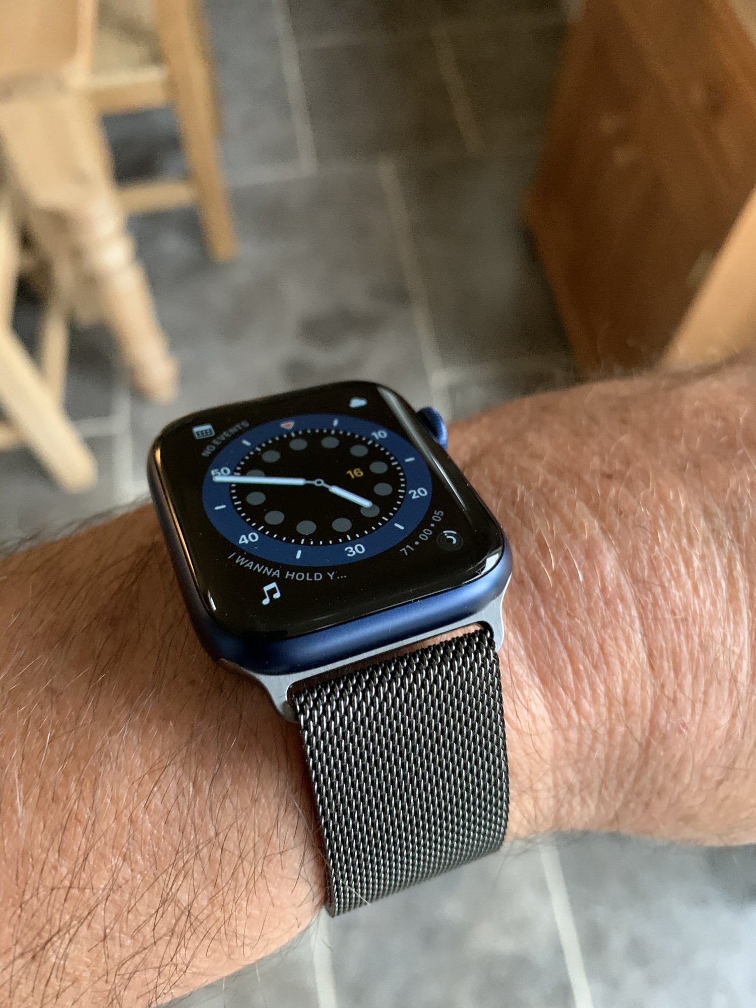 Really like this! Went with the SS Milanese/blue aluminum. Fav combo so far!Blue 44m with graphite Milanese loop. Of all the straps I think this is best combo. This and white band!